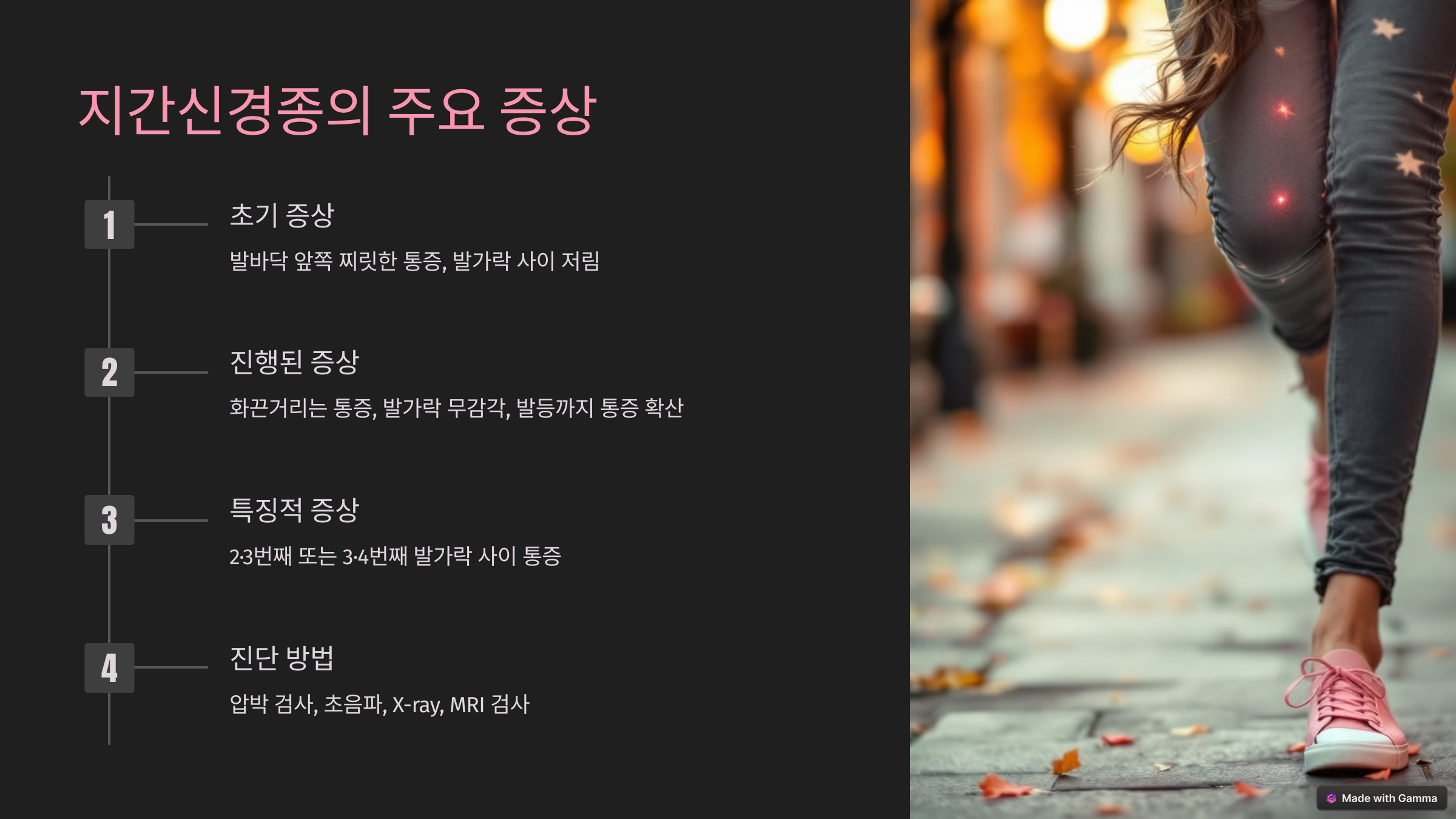 지간신경종은 주로 2·3번째 또는 3·4번째 발가락 사이에 발생합니다. 👞 신발을 벗으면 통증이 일시적으로 완화되며, 걸음을 내딛을 때마다 찌릿한 통증이 반복적으로 나타납니다. 또한, 발바닥 앞쪽에 압박감이 지속되며, 신발을 신었을 때 특히 심한 통증을 느끼게 됩니다.