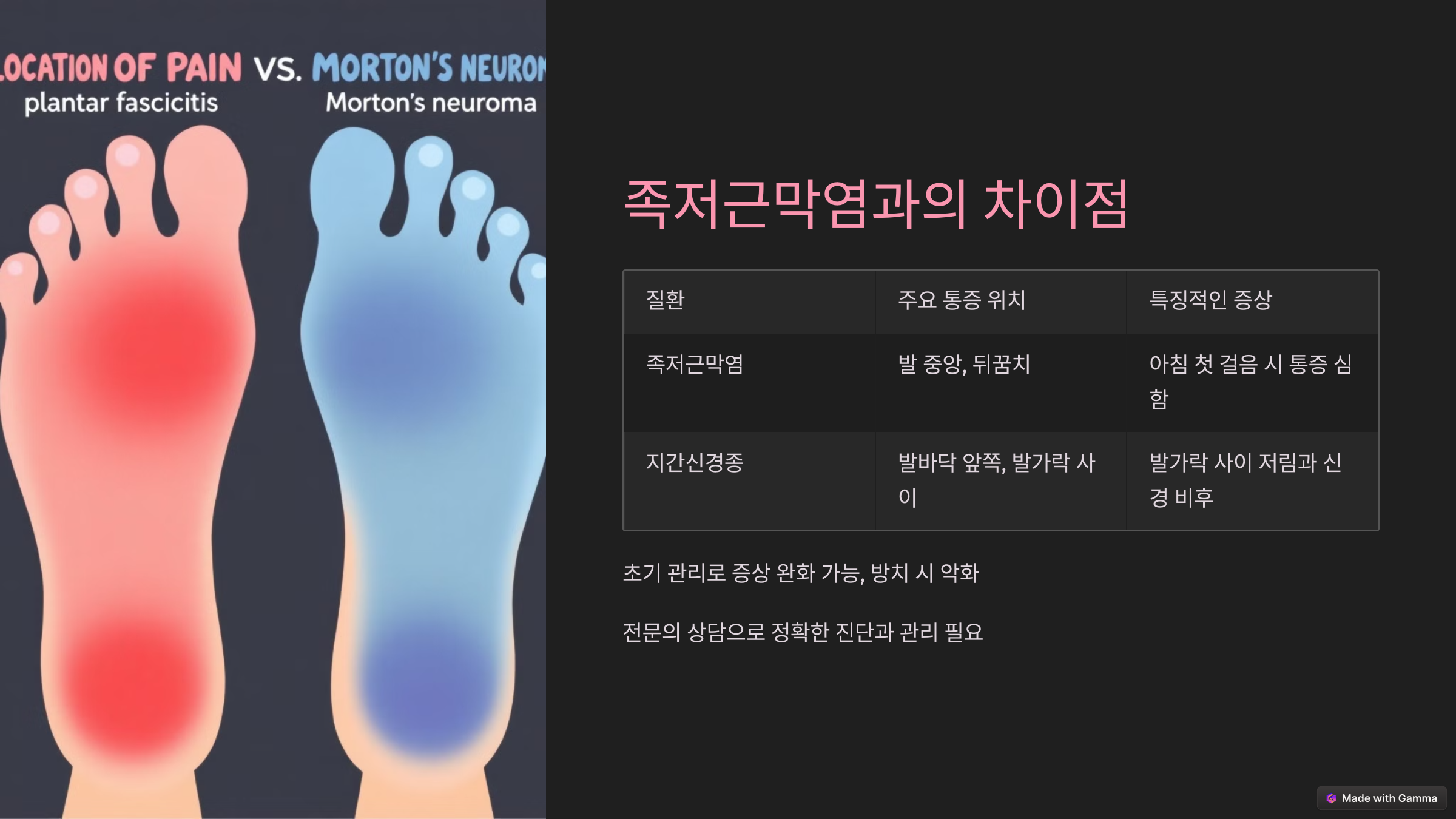 지간신경종은 족저근막염과 혼동될 수 있으나, 증상에서 명확한 차이가 있습니다. 아래 표를 통해 두 질환의 차이점을 간단히 비교해 보세요:
