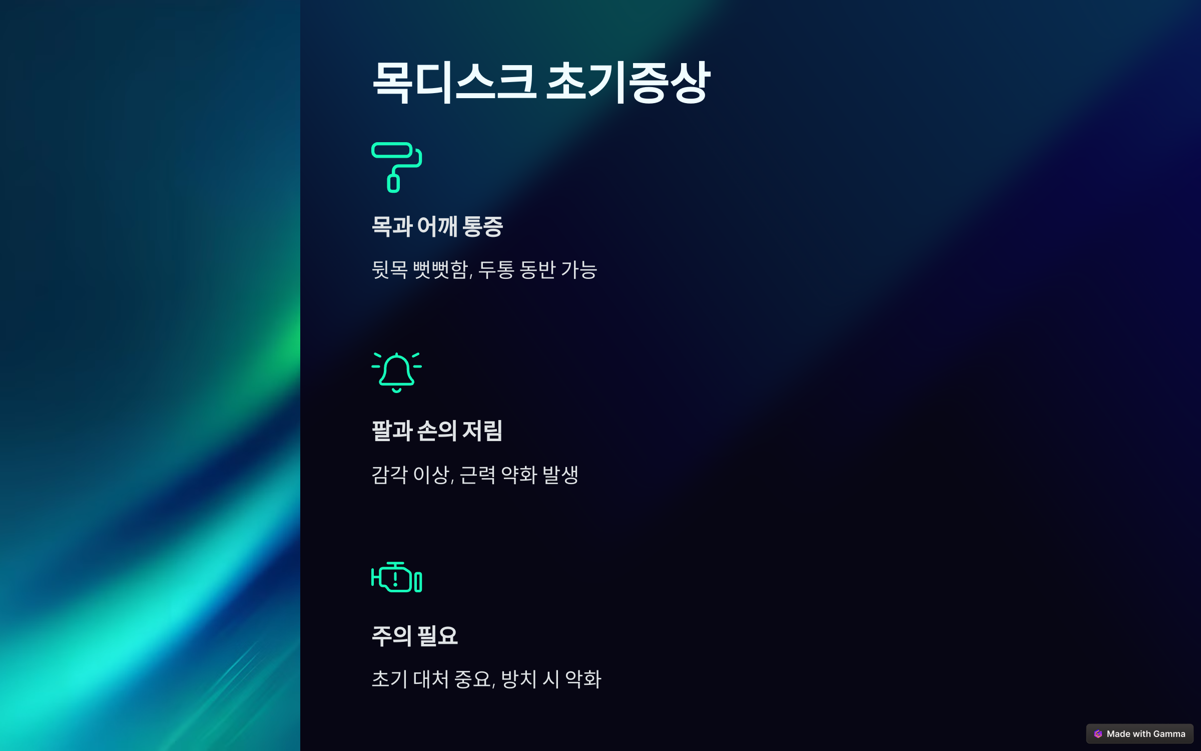 목디스크 초기증상으로는 목과 어깨의 통증, 뒷목이 뻣뻣한 느낌, 팔과 손의 저림 또는 감각 이상 🖐️ 등이 있습니다. 특히 목 통증과 함께 두통 🤯이 동반되는 경우가 많은데, 이는 목 주변 신경이 압박되어 나타나는 증상입니다. 이러한 두통은 스트레칭이나 바른 자세 유지로 완화될 수 있으며, 통증이 지속될 경우 전문가의 상담을 받는 것이 좋습니다. 또한 팔의 근력 약화, 손의 힘이 약해지는 증상도 목디스크의 신호일 수 있으므로 주의가 필요합니다.