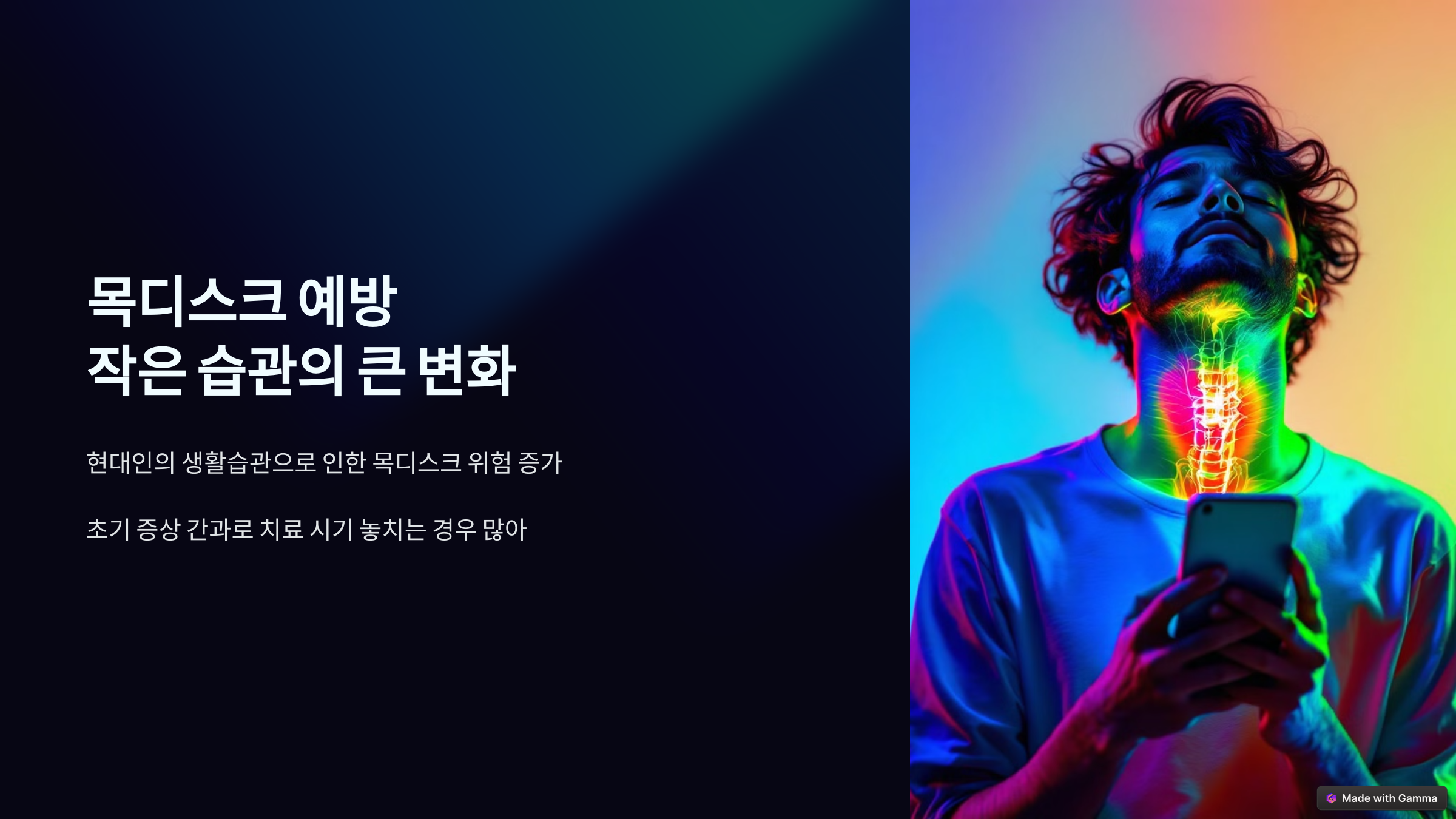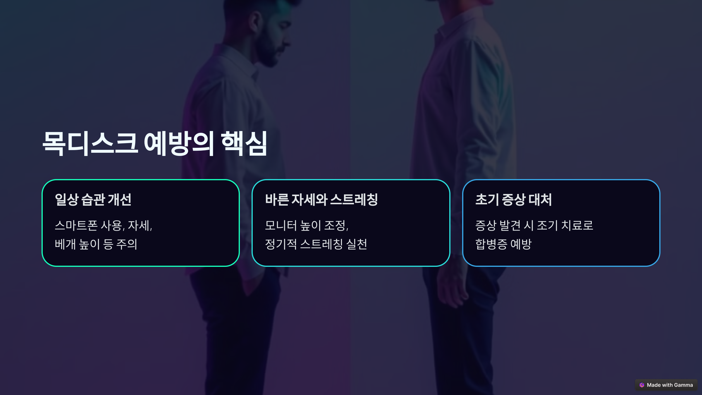 목디스크는 일상생활 속 작은 습관들이 누적되어 발생하는 질환입니다. 예를 들어, 장시간 스마트폰 사용, 잘못된 자세로 앉기 🪑, 높은 베개 사용, 충분한 스트레칭 부족 🚫 등이 목디스크 발생에 영향을 미칠 수 있습니다. 평소 바른 자세를 유지하고 목 건강을 위한 스트레칭을 자주 하는 등 예방이 무엇보다 중요합니다. 모니터와 책상의 높이를 조정하고 💻, 스마트폰을 사용할 때 고개를 들고 사용하는 습관을 기르는 것만으로도 큰 예방 효과를 볼 수 있습니다. 하지만 목디스크 증상이 나타난다면 초기에 적극적으로 치료받는 것이 합병증을 예방할 수 있는 최선의 방법이 될 것입니다. 작은 변화가 큰 차이를 만들 수 있으니 오늘부터 실천해 보세요.