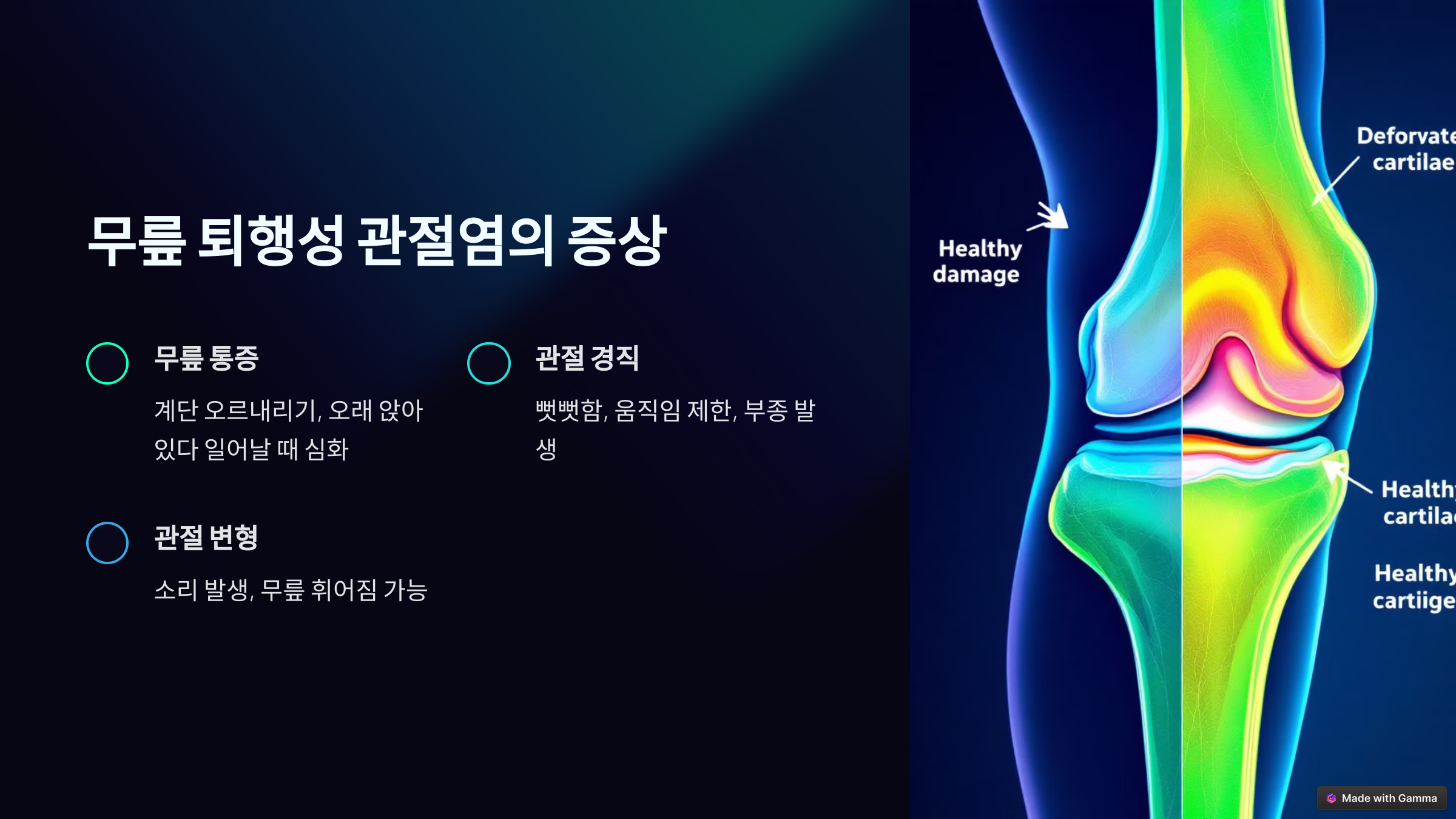 무릎 퇴행성 관절염의 가장 흔한 증상은 무릎 통증입니다. 특히 계단을 오르내릴 때, 오래 앉아있다 일어날 때, 장시간 걷거나 뛸 때 통증이 심해질 수 있습니다. 이는 이러한 동작들이 무릎 관절에 큰 압력을 가하고 연골에 부담을 주기 때문입니다. 또한, 무릎 관절이 뻣뻣하고 움직임이 제한되며, 부종 💦이 발생할 수 있습니다. 심한 경우 무릎에서 소리가 나거나 🔊 무릎이 휘는 변형이 나타날 수도 있습니다.