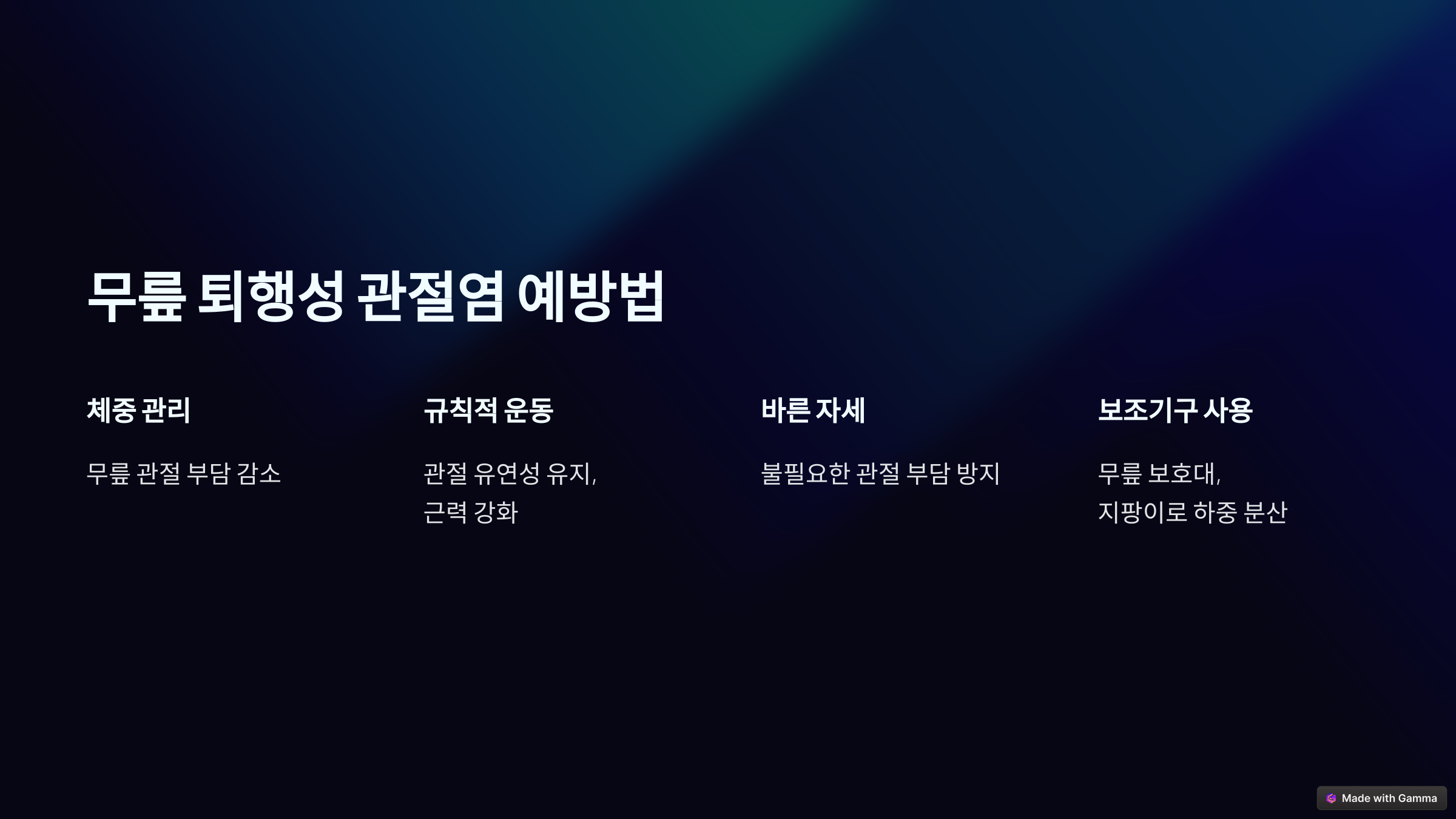 무릎 퇴행성 관절염을 예방하기 위해서는 평소 건강한 생활 습관을 유지하는 것이 중요합니다. 적절한 체중 관리, 규칙적인 운동, 바른 자세 유지 등이 도움 될 수 있습니다.