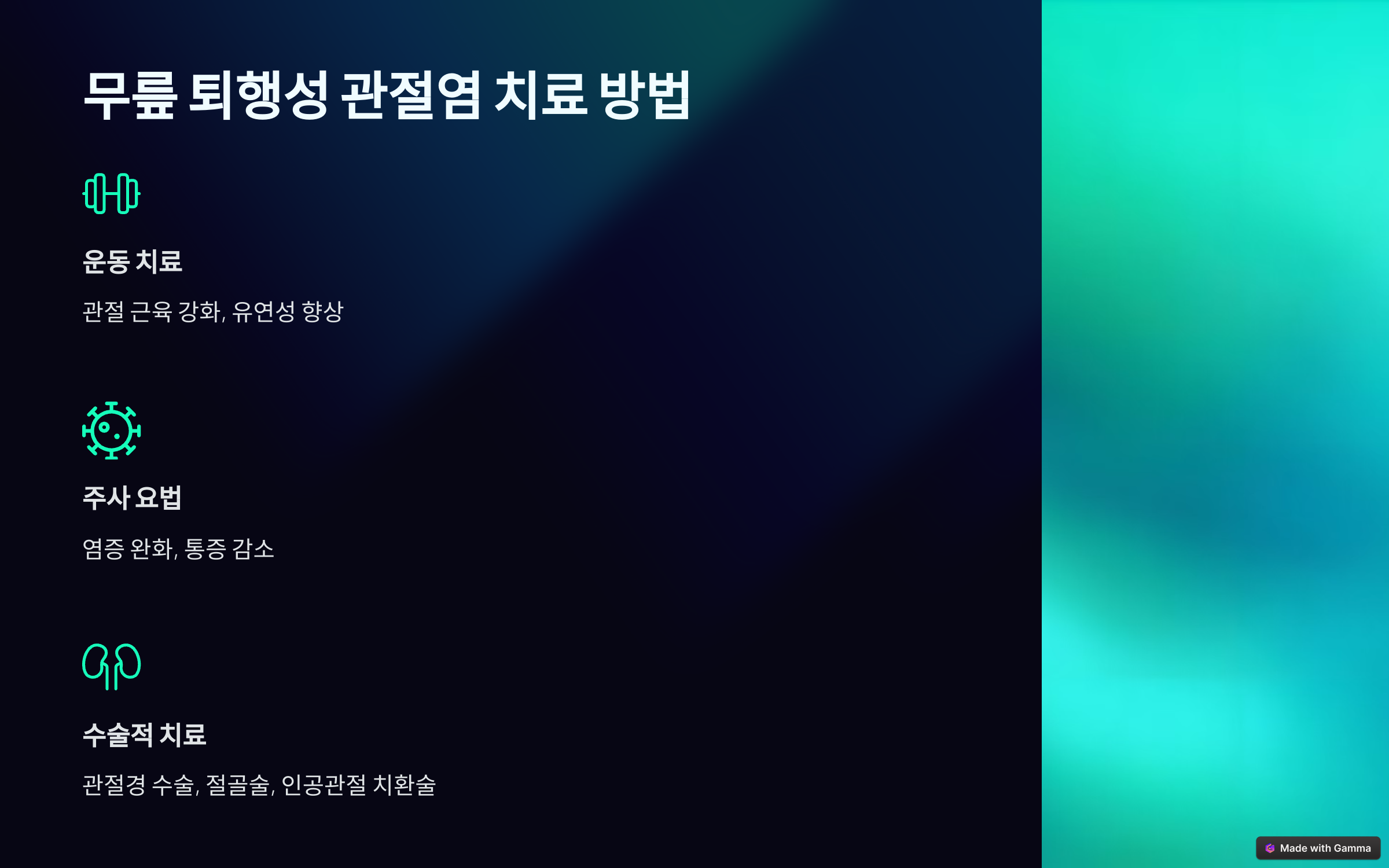 무릎 퇴행성 관절염의 치료 방법에는 운동, 주사, 수술 등이 있습니다. 각 치료 방법은 관절염의 진행 정도에 따라 달라질 수 있으며, 적절한 방법을 선택하는 것이 중요합니다.