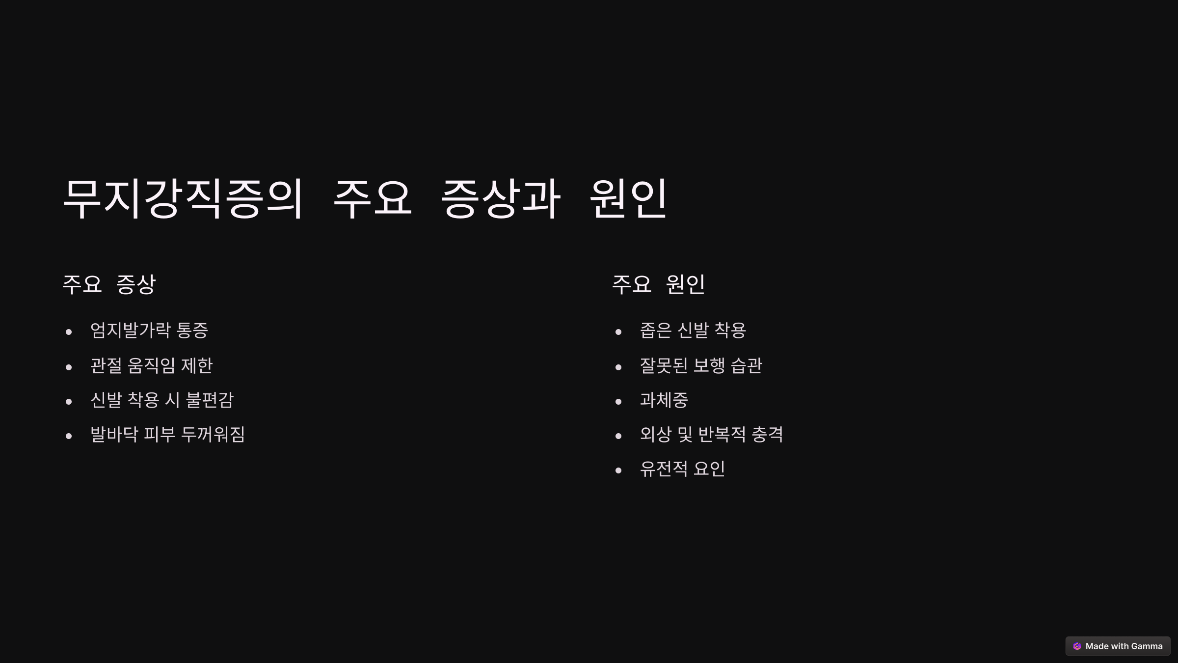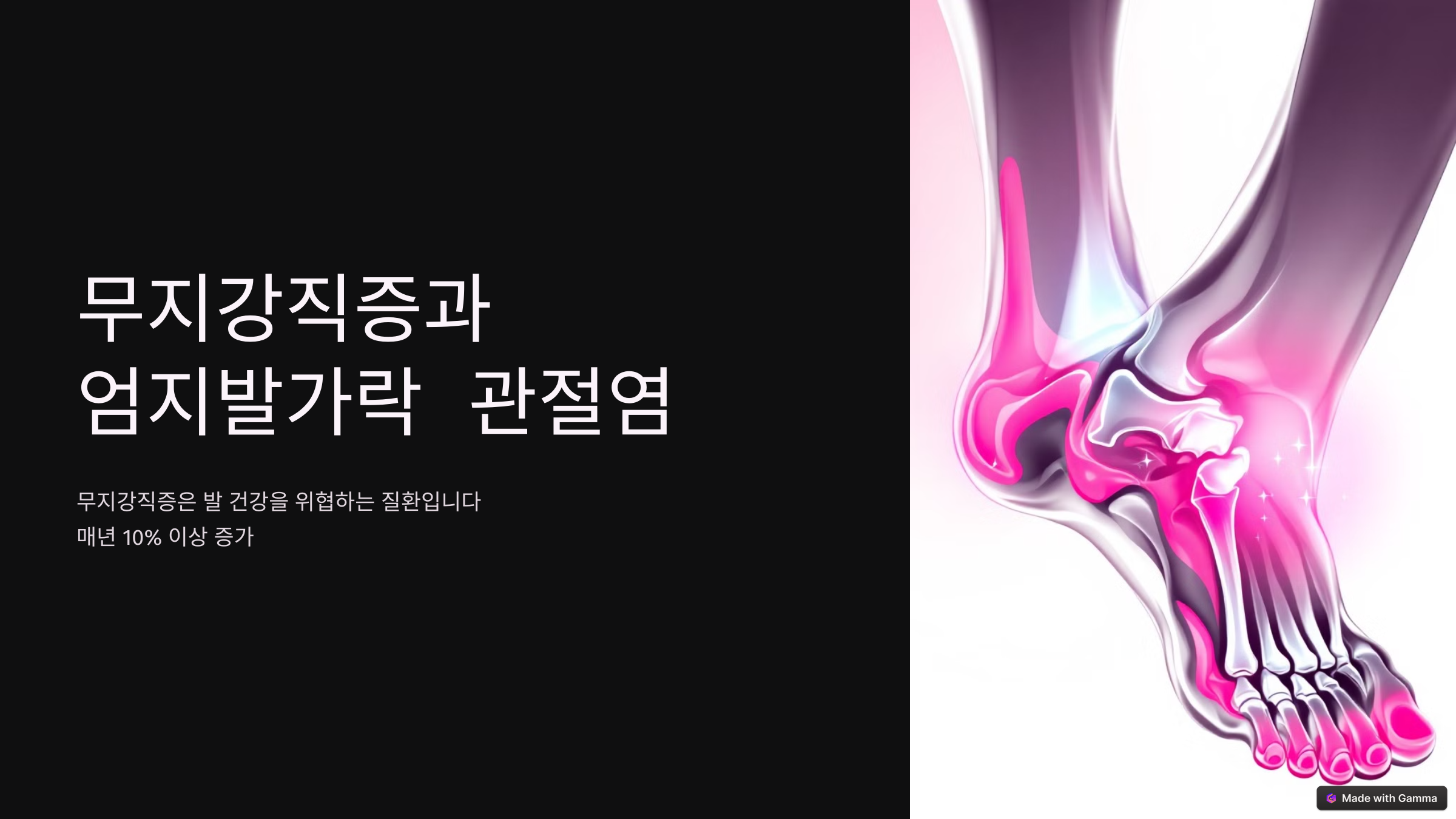 무지강직증은 초기에 발견하고 관리하면 일상생활의 불편을 크게 줄일 수 있는 질환입니다. 발 건강은 우리의 전신 건강과도 밀접하게 연관되어 있으므로, 조금이라도 이상을 느낀다면 빠르게 전문의의 진료를 받아보는 것이 좋습니다. 발의 작은 통증도 방치하지 않고 관리하는 습관이 건강한 일상을 유지하는 첫걸음이 될 것입니다. 🦶✨