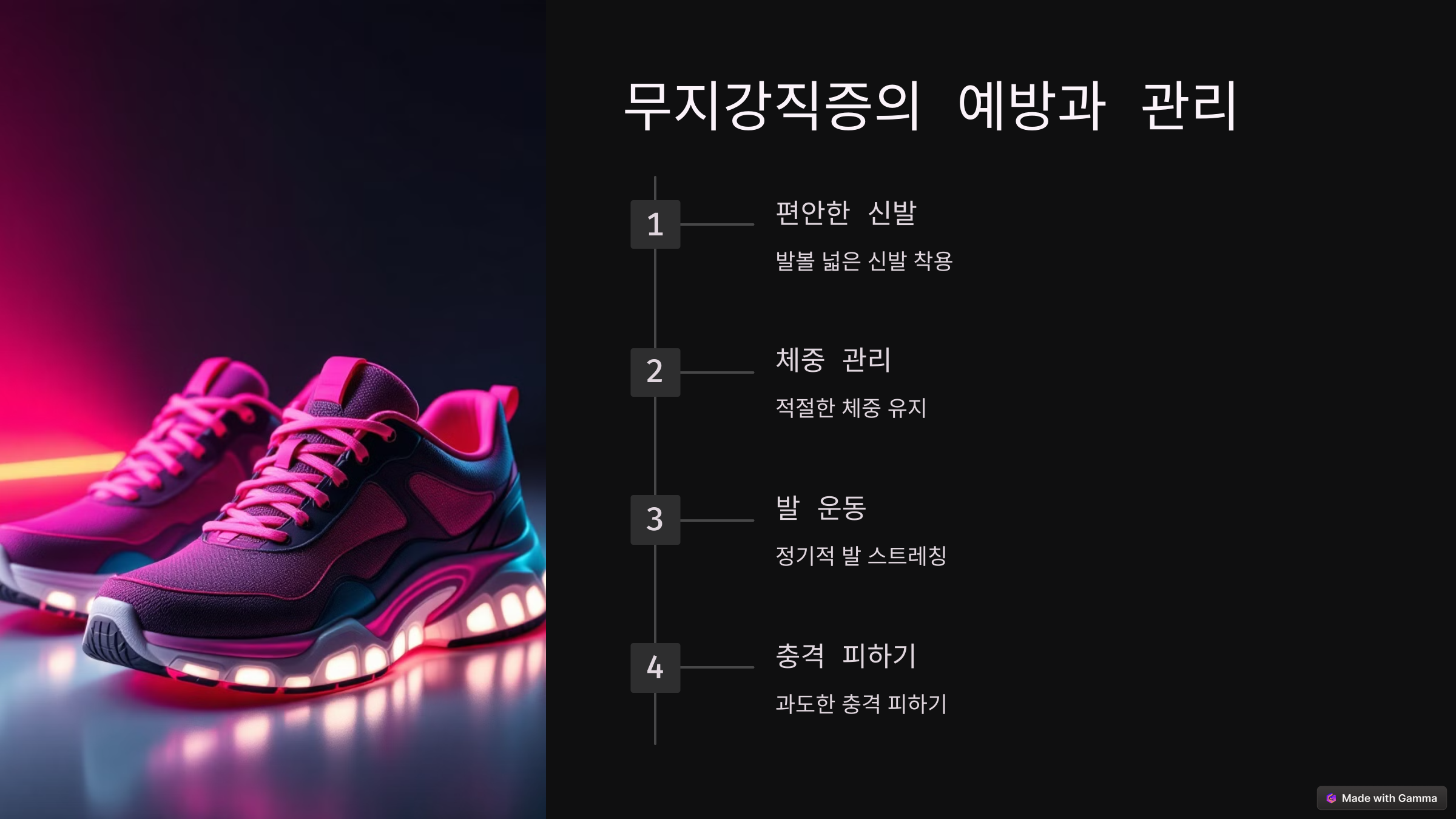 - 과도한 충격을 주는 활동 피하기 🚫: 발에 무리가 가는 활동을 피하고, 무리한 운동보다는 저 충격 운동을 통해 관절을 보호해야 합니다.