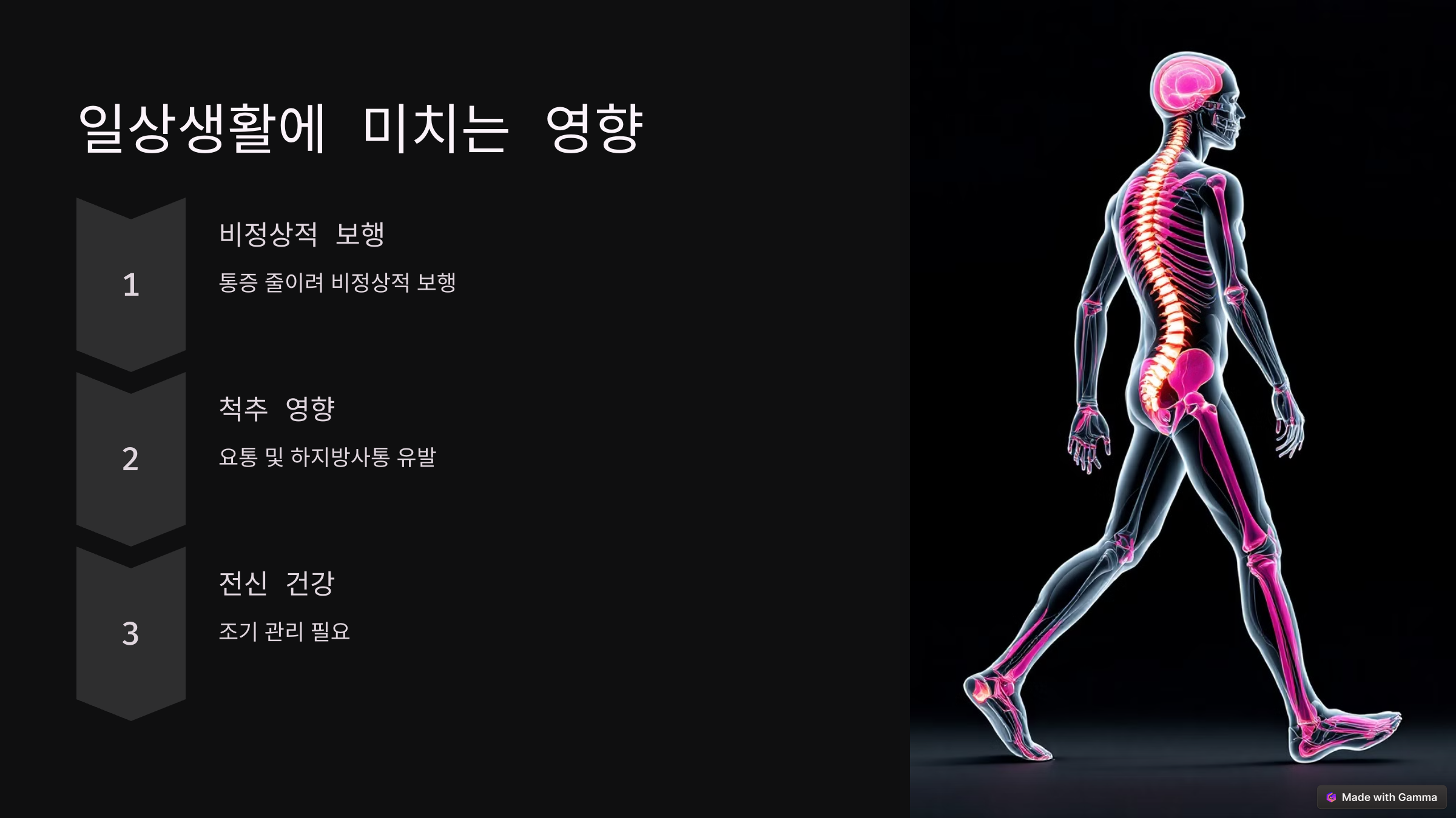 무지강직증은 단순히 발에 국한된 문제가 아닙니다. 통증을 줄이기 위해 발을 기울인 채 걷는 비정상적인 보행 습관이 생기게 되고, 이는 척추에도 영향을 미쳐 요통이나 하지방사통과 같은 2차적인 문제를 일으킬 수 있습니다. 이러한 문제를 방지하기 위해서는 바른 자세로 걷는 습관을 유지하고, 필요시 전문의와 상담하여 보행 교정을 받는 것이 중요합니다. 조기에 적절한 관리가 이루어지지 않으면 전신 건강에도 악영향을 미칠 수 있습니다.