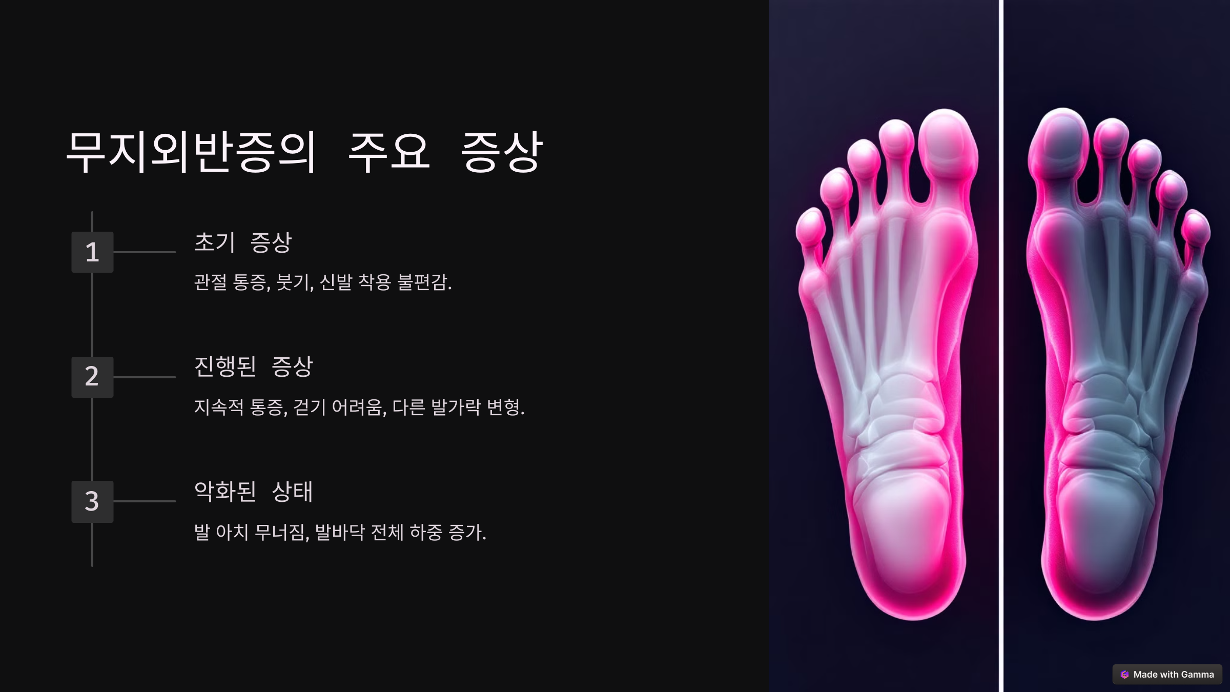 - 초기 증상: 엄지발가락 관절 부위의 통증, 돌출된 부위의 붓기와 발적, 신발 착용 시 불편감, 발바닥 피부 두꺼워짐. 👣 통증이 간헐적으로 나타나며, 신발을 신었을 때 불편함이 주로 느껴집니다. 발바닥에 굳은살이 생기거나 발이 쉽게 피로해지기도 합니다.