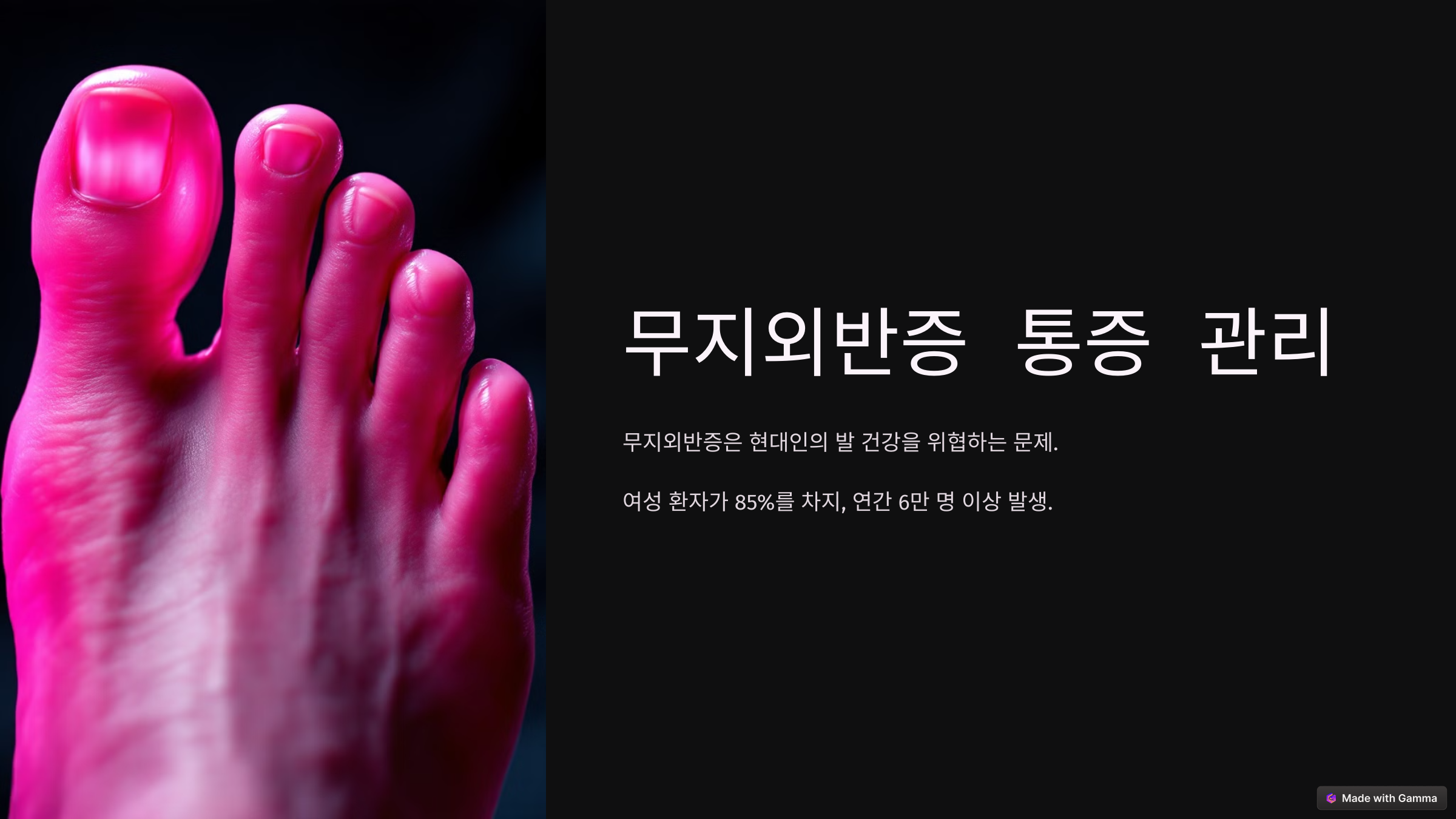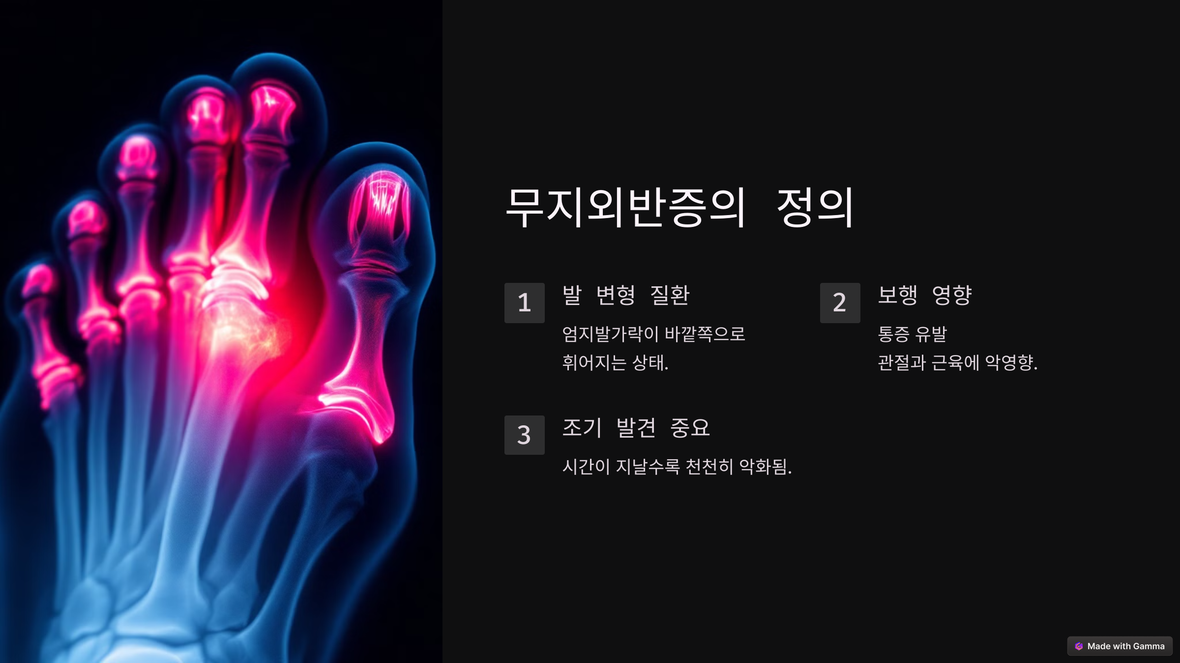 무지외반증은 단순한 외적인 문제가 아닌, 발의 기능과 전반적인 건강에 심각한 영향을 미치는 발 변형 질환입니다. ⚠️ 이는 보행 시 통증을 유발하고, 장기적으로 발의 다른 부분에도 부담을 주어 관절과 근육에 악영향을 미칠 수 있습니다. 시간이 지날수록 천천히 악화되므로 조기 발견과 치료가 중요합니다. 초기에는 가벼운 불편감으로 시작되지만, 이를 방치할 경우 심각한 통증과 변형으로 이어질 수 있습니다. 초기 통증이 경미해 무시하기 쉽지만, 시간이 지나면 만성 통증으로 발전해 일상생활에 큰 불편을 초래할 수 있습니다. 🚶♀️