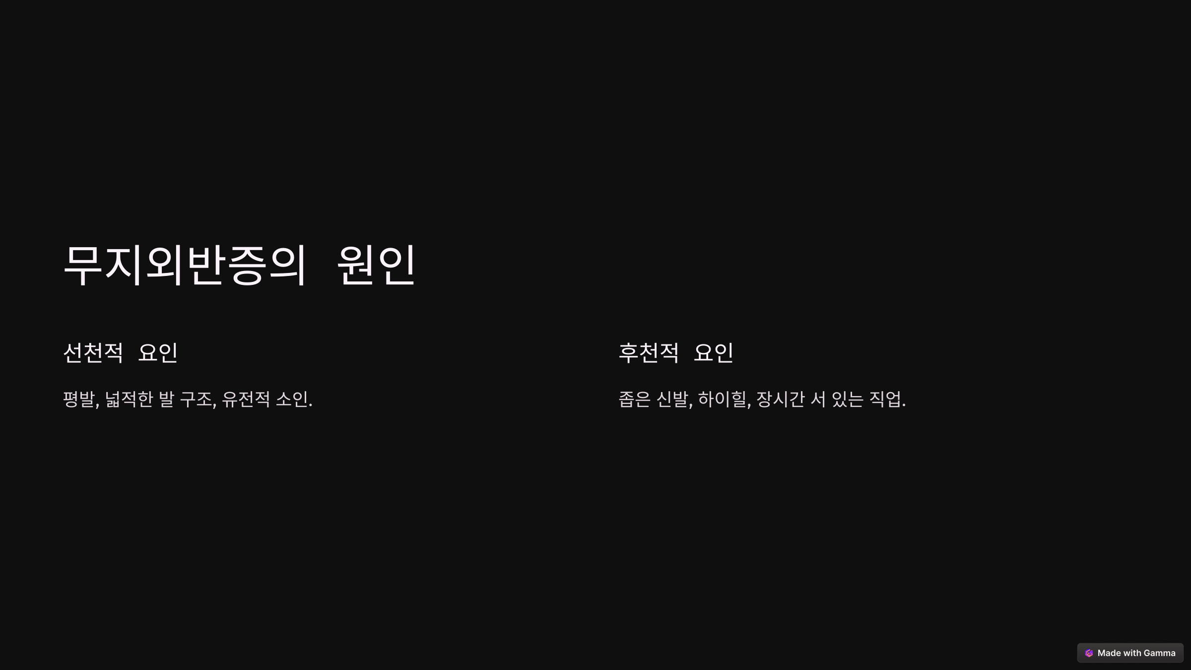 - 선천적 요인: 🧬 평발, 넓적한 발 구조, 유전적 소인 등이 있습니다. 환자의 약 60%가 가족력이 있다는 연구 결과가 있습니다. 유전적으로 발의 아치가 낮거나 발가락의 형태가 특정 방식으로 형성된 경우 무지외반증이 더 쉽게 발생할 수 있습니다.