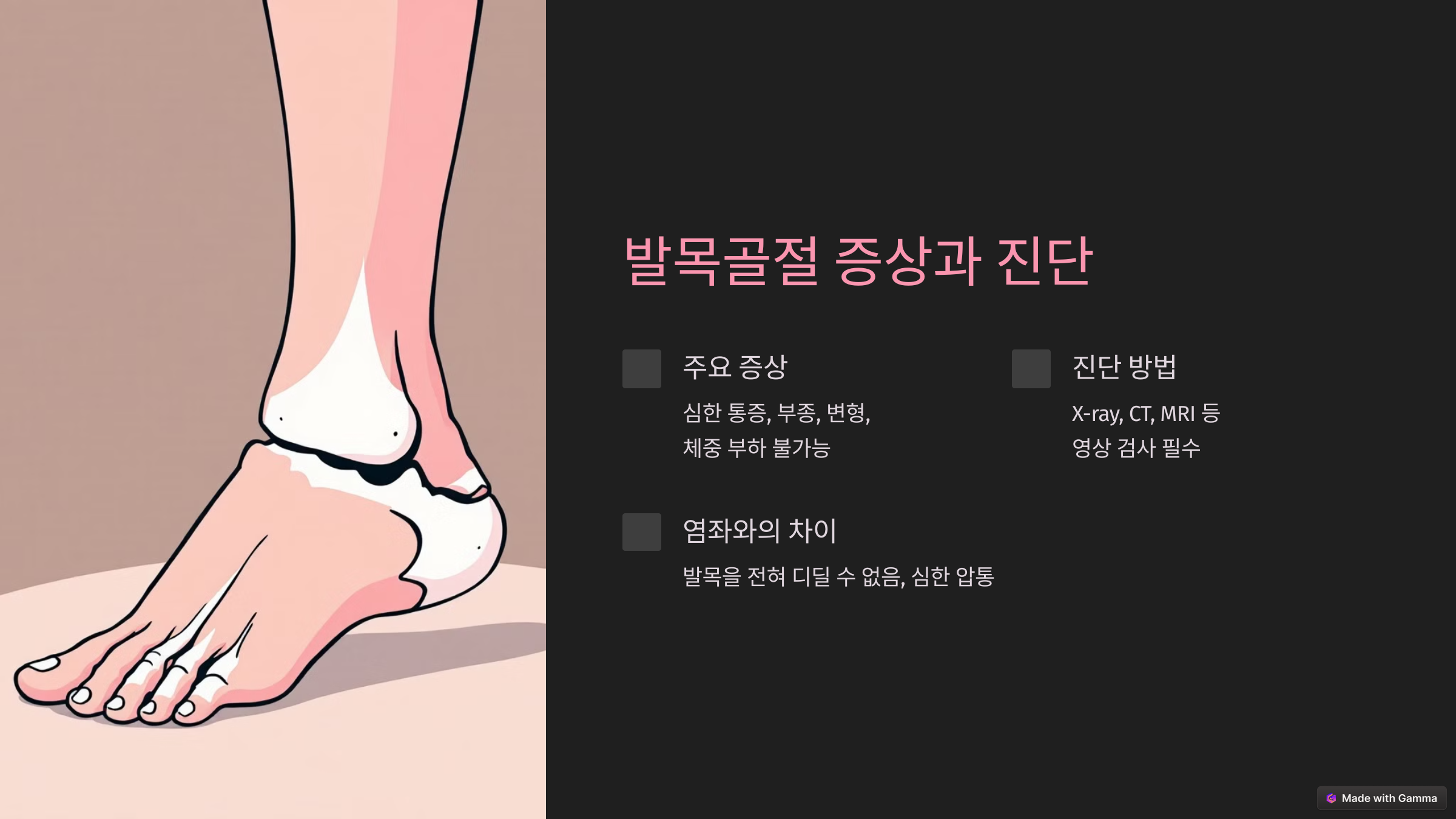 발목골절은 체중 부하가 불가능하고 심한 통증과 변형이 동반됩니다. 반면 염좌는 상대적으로 증상이 경미하고 회복이 빠릅니다. - Q2. 통깁스는 얼마나 착용해야 하나요?