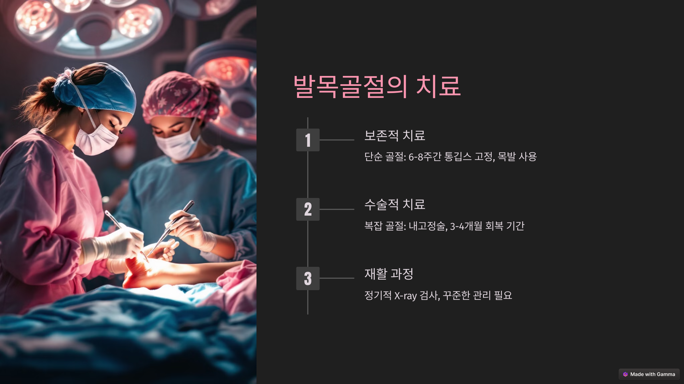 발목골절의 치료는 골절의 양상에 따라 보존적 치료와 수술적 치료로 나뉩니다.
