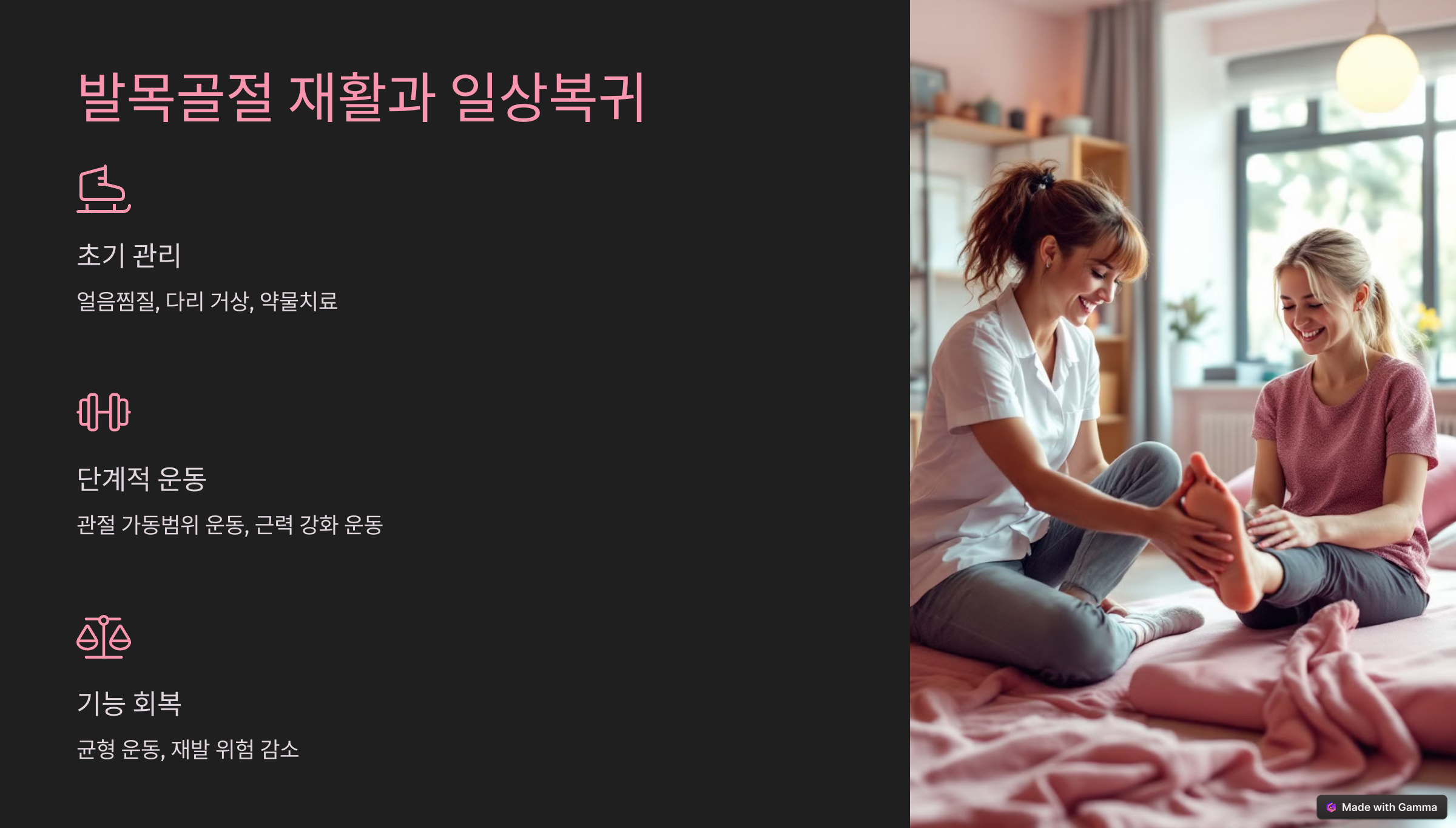 재활 운동은 반드시 전문가의 지도하에 단계적으로 진행되어야 하며, 통증이나 부종이 심해지면 즉시 운동을 중단하고 의사와 상담하는 것이 중요합니다. 발목 주변 근육을 강화하고 관절의 안정성을 높이는 데 초점을 맞추며, 균형 운동 ⚖️과 근력 운동을 통해 발목의 기능을 회복하고 재발 위험을 줄이는 것이 목표입니다.