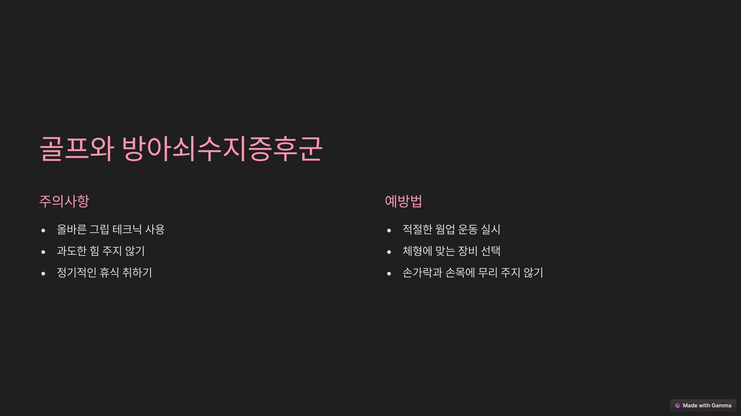 골프와 같은 운동은 손가락을 많이 사용하는 활동으로, 방아쇠수지증후군을 악화시킬 수 있습니다. 특히 반복적인 그립 동작과 강한 힘이 손가락 힘줄에 지속적인 부담을 주어 염증을 악화시키고, 손가락이 걸리는 증상을 더 자주 유발할 수 있습니다. 따라서 골프를 할 때는 다음과 같은 사항에 주의해야 합니다.