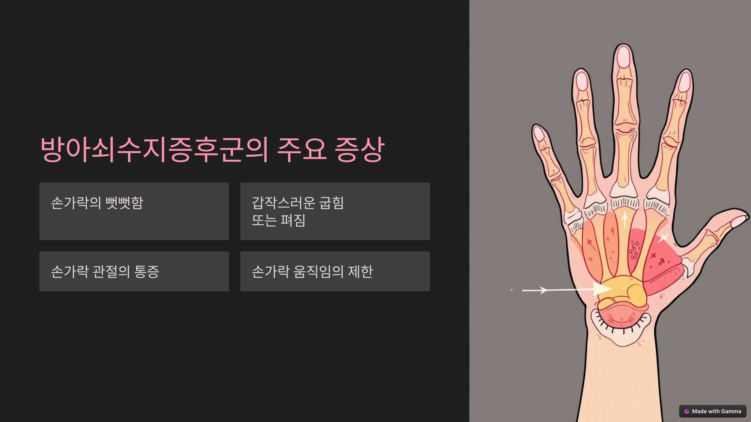 - 손가락의 뻣뻣함: 특히 아침에 손가락이 뻣뻣해지며 움직이기 어려운 경우가 많습니다.