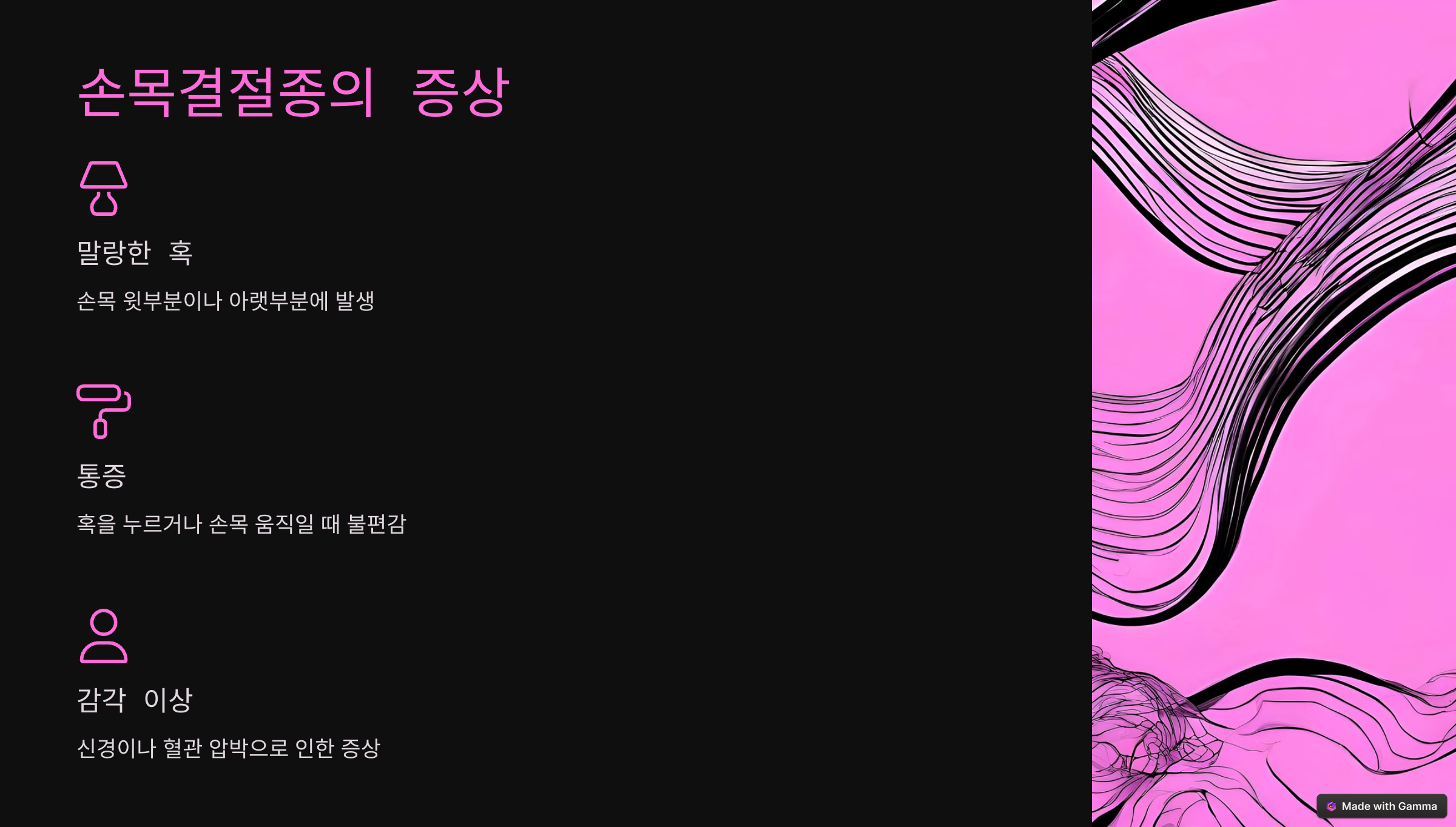 - 신경이나 혈관 압박으로 인한 감각 이상: 크기가 커지면 손목의 감각 이상 발생.