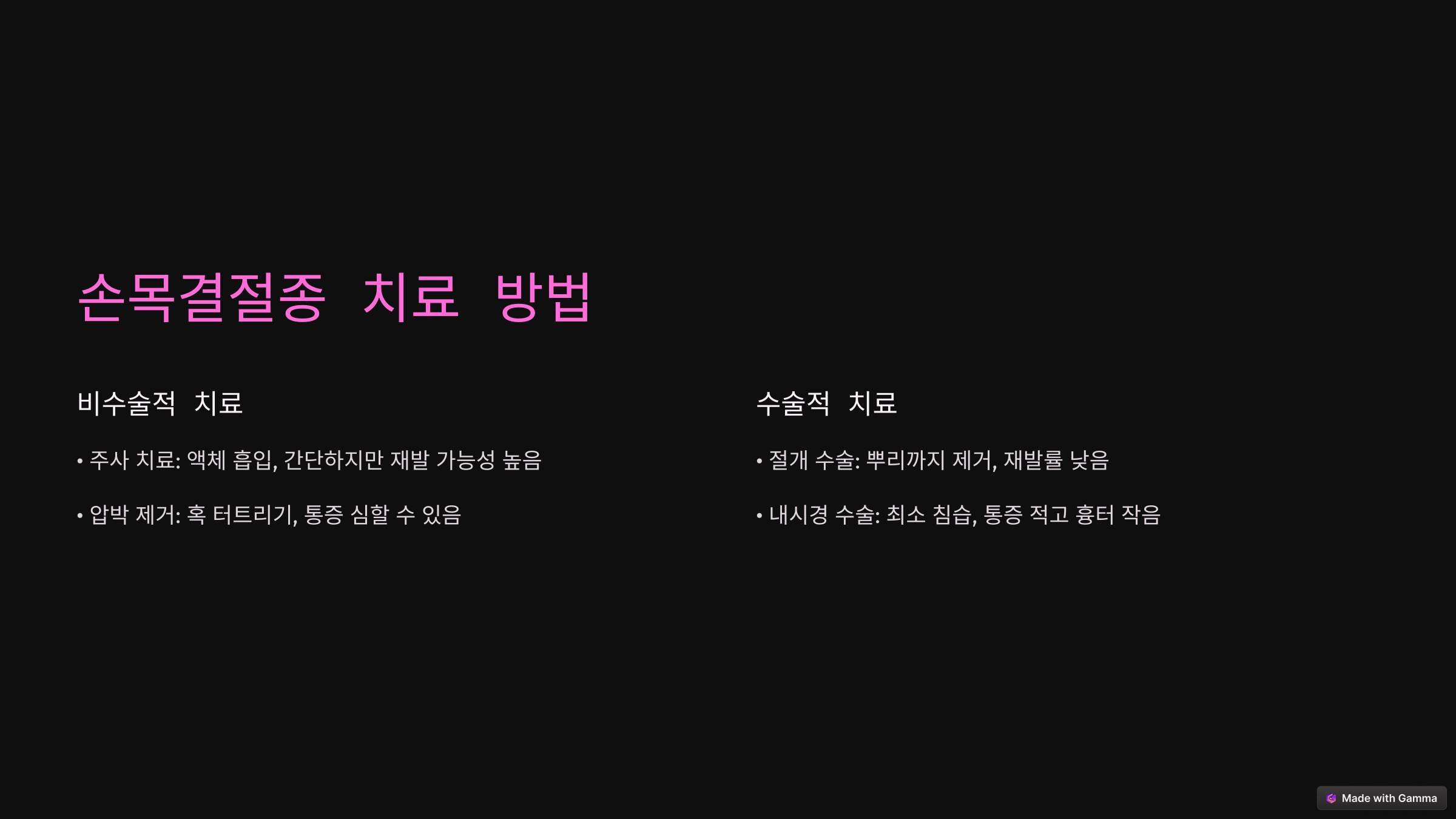 - 주사 치료 💉: 결절종 내부의 액체를 흡입하는 방법. 간단하고 흉터가 적지만 재발 가능성이 높음.