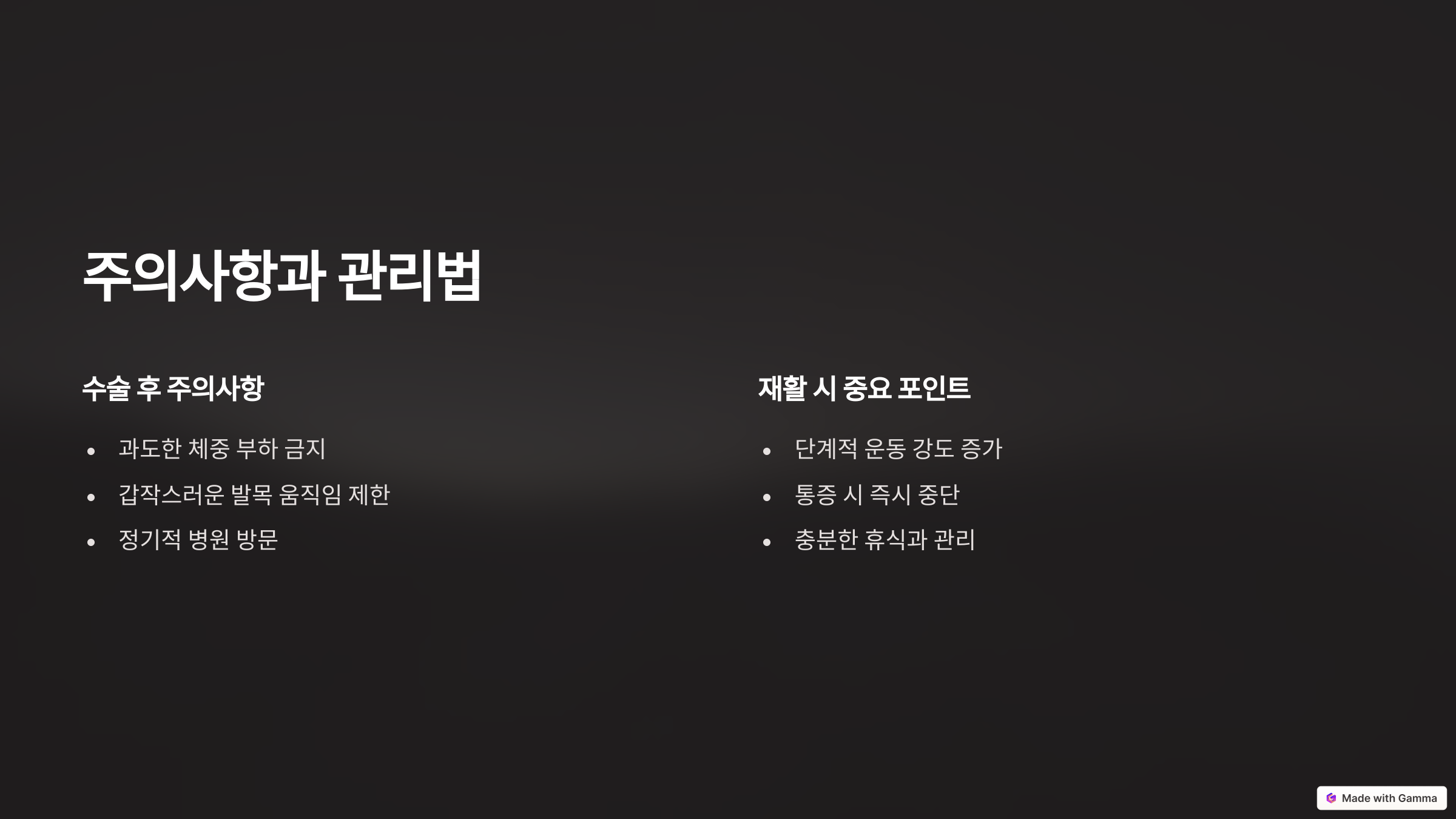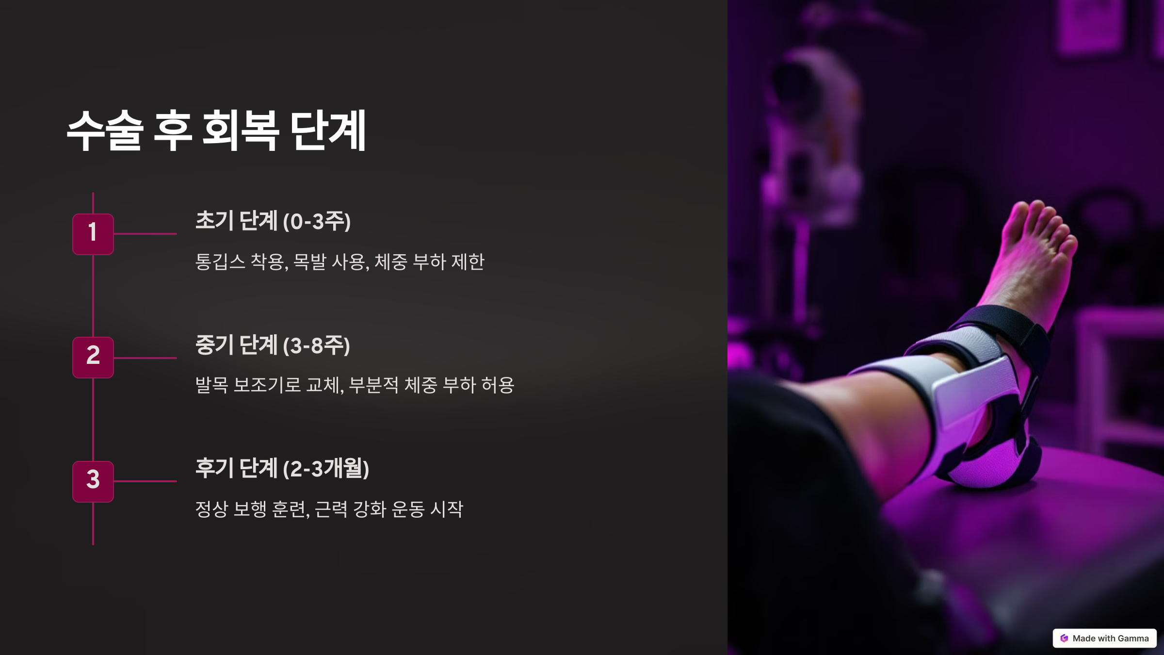 - ❌ 과도한 체중 부하 금지: 수술 후 초기에는 발에 체중을 실지 않도록 주의해야 합니다.