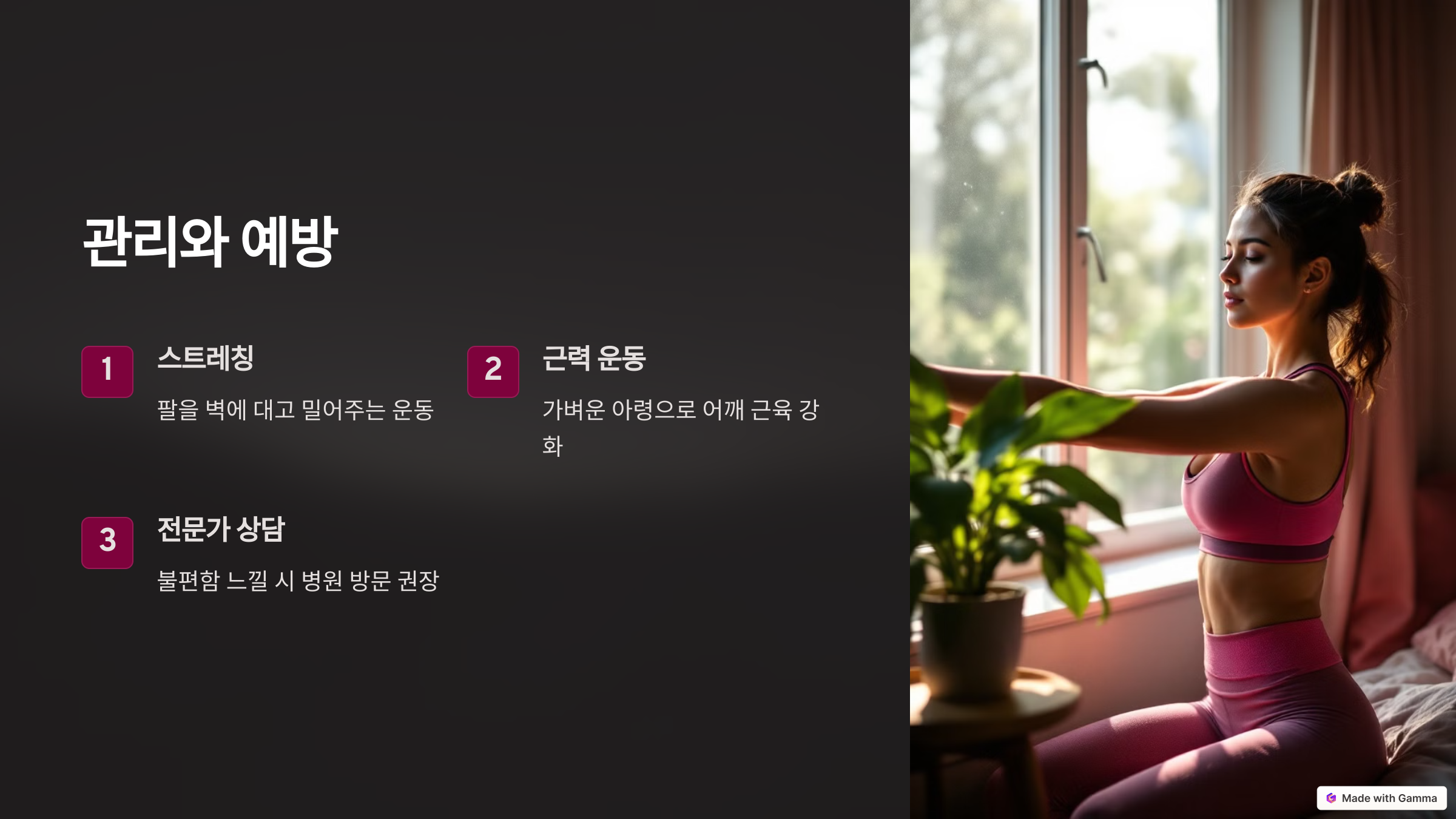 A4. 꾸준한 스트레칭과 어깨 근육 강화 운동을 통해 어깨 주변 조직을 유연하게 유지하는 것이 도움이 됩니다. 특히, 어깨를 과도하게 사용하지 않도록 주의하고, 올바른 자세를 유지하는 것도 중요합니다.