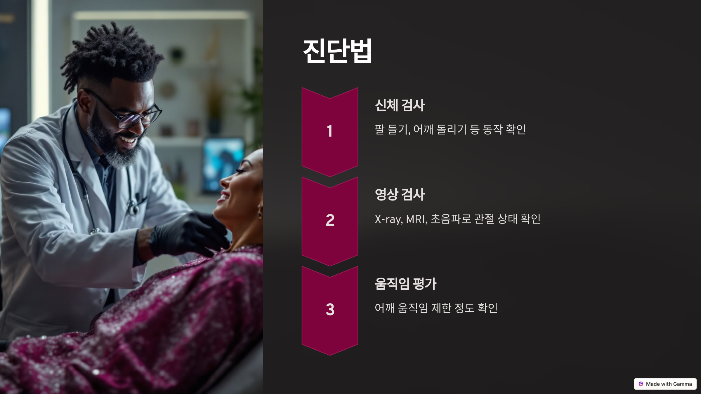 오십견은 환자의 어깨 움직임 제한 정도를 확인하는 것으로 진단이 이루어집니다. X-ray와 초음파 검사를 통해 어깨 관절의 유착 여부를 확인하며, 팔을 들어 올리거나 돌리는 범위가 제한되었는지를 확인합니다. 오십견은 어깨 움직임이 둔해지고 통증이 발생하는 것이 특징으로, 다른 어깨 질환과의 구별이 필요합니다.