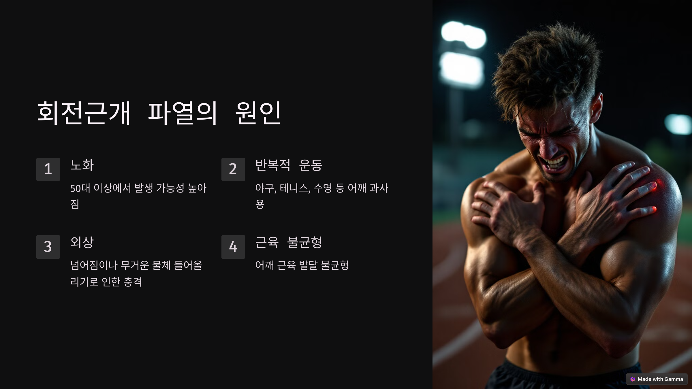 - 🕒 노화: 50대 이상에서 회전근개가 약해지면서 파열이 발생할 가능성이 높습니다. 나이가 들수록 근육과 힘줄이 약해지고 탄력이 감소하기 때문입니다. 특히, 노화로 인해 어깨 부위의 혈류 공급이 줄어들어 회복이 더뎌질 수 있습니다.