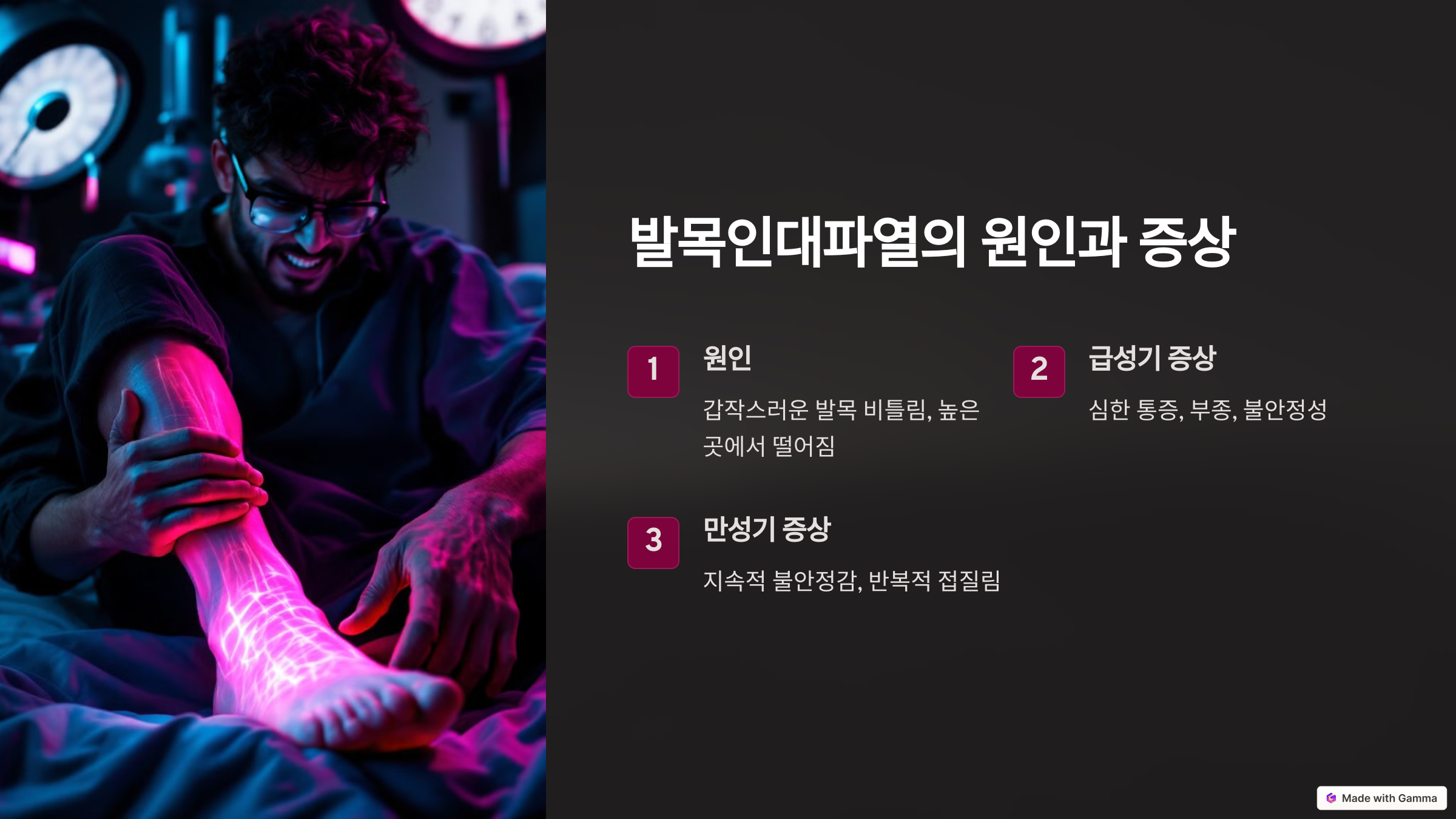 - 🔄 지속적인 불안정감: 부상 후 제대로 치료되지 않으면 발목의 불안정감이 계속될 수 있습니다.