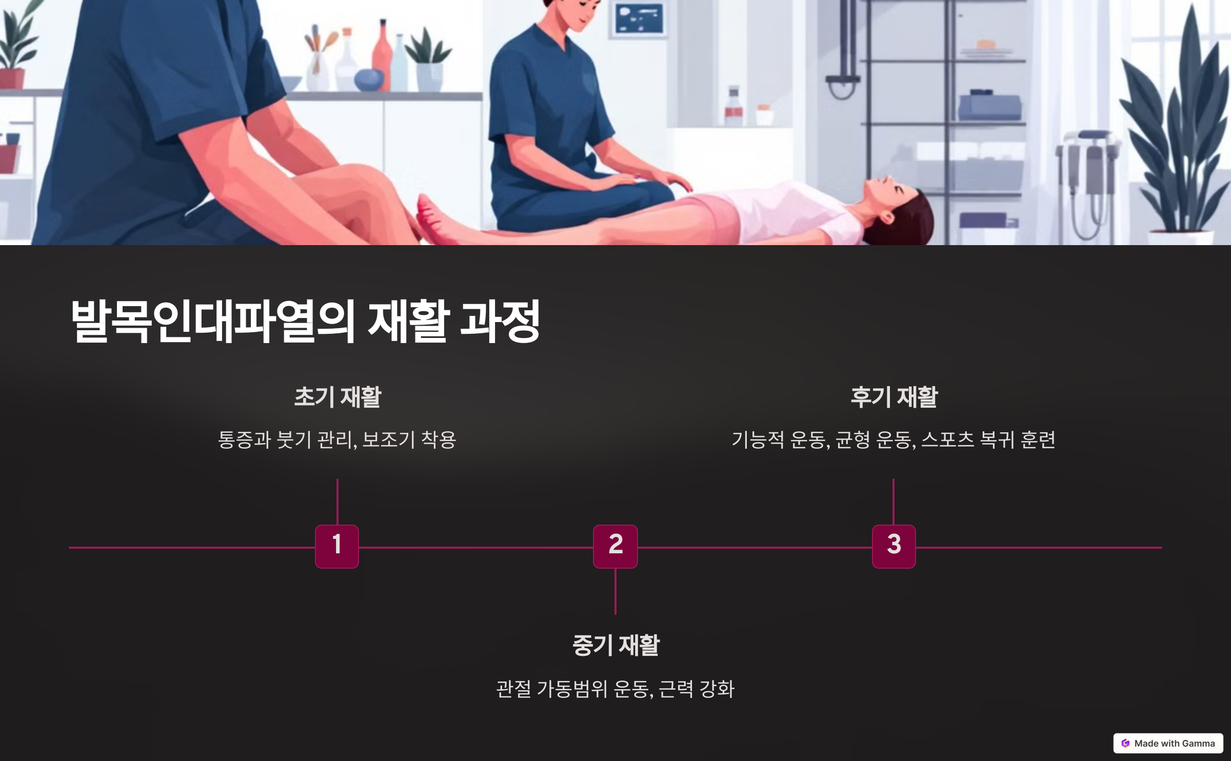 - 3도 손상: 인대의 완전 파열로, 심한 붓기와 통증이 있으며 보행이 불가능한 상태입니다.