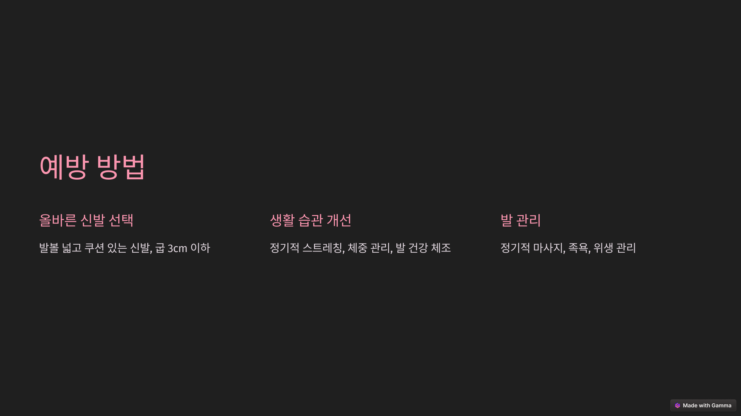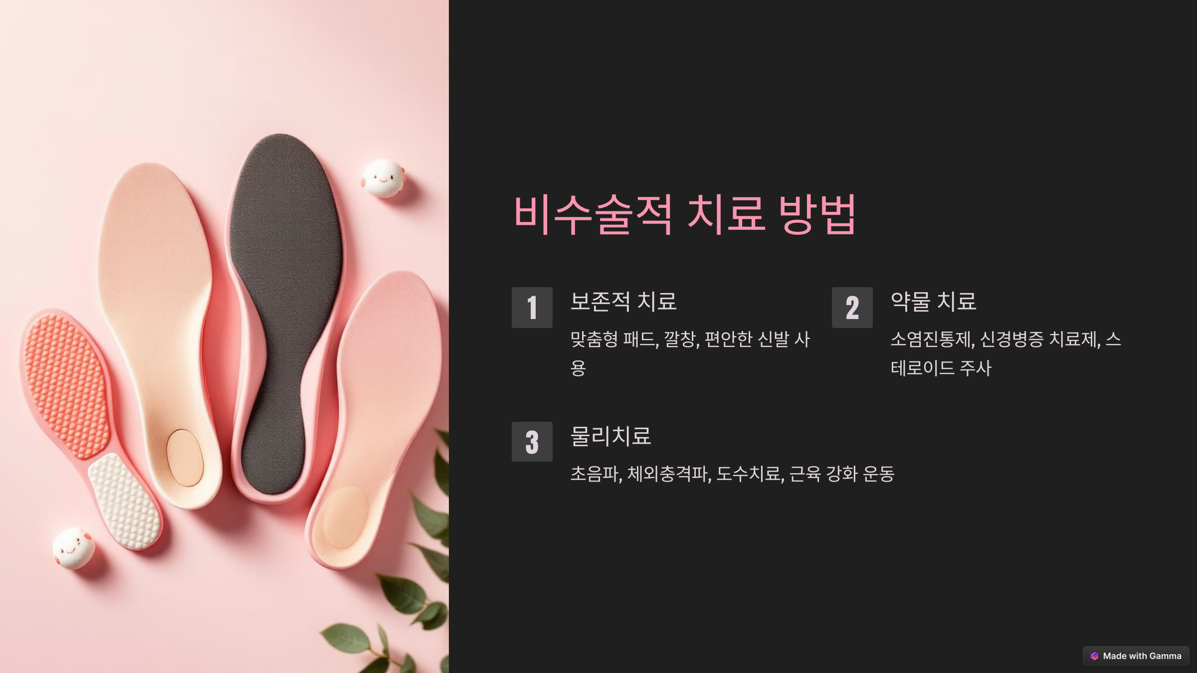 - 🛏️ 휴식과 압박 감소: 발에 가해지는 압박을 줄이고 충분한 휴식을 취해 통증을 완화합니다.