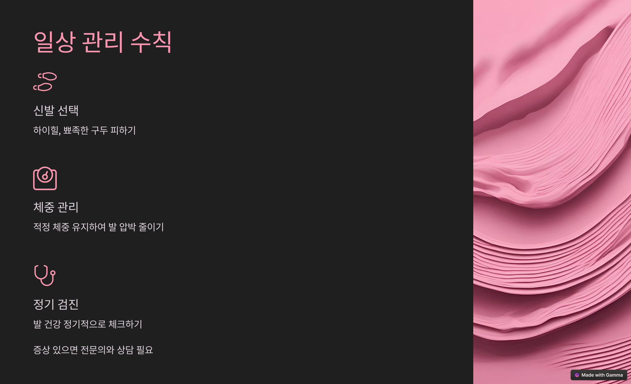 - 👠 하이힐이나 뾰족한 구두는 피하고, 발에 무리가 가는 운동도 자제합니다.