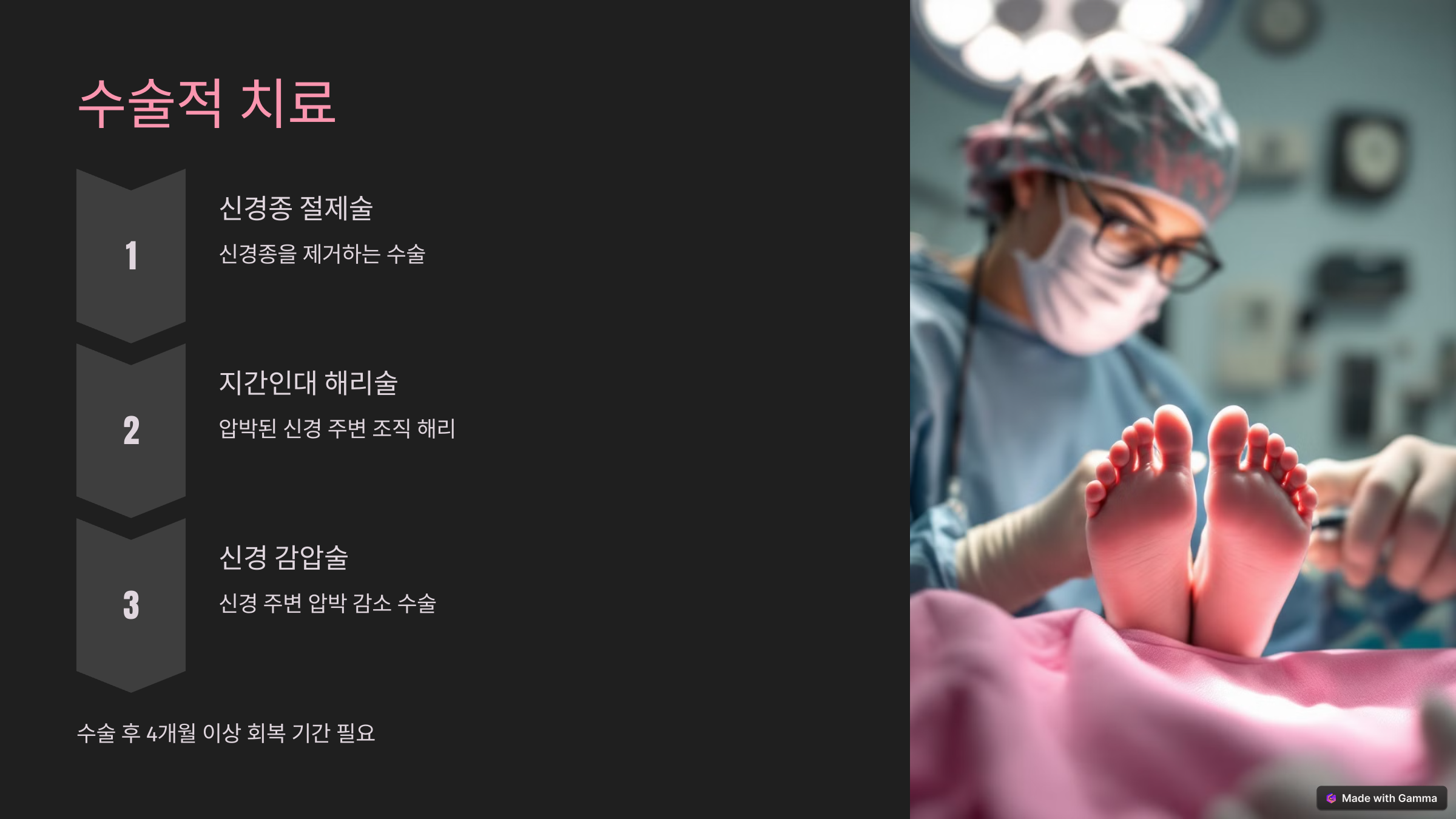 보존적 치료에 반응하지 않거나 증상이 심각한 경우 수술이 필요할 수 있습니다. 주요 수술 방법으로는 🔪 신경종 절제술, 🔧 지간인대 해리술, 🔩 신경 감압술 등이 있습니다. 수술 후에는 4개월 이상의 회복 기간과 재활 운동이 필요하며, 적절한 신발을 착용해야 합니다.