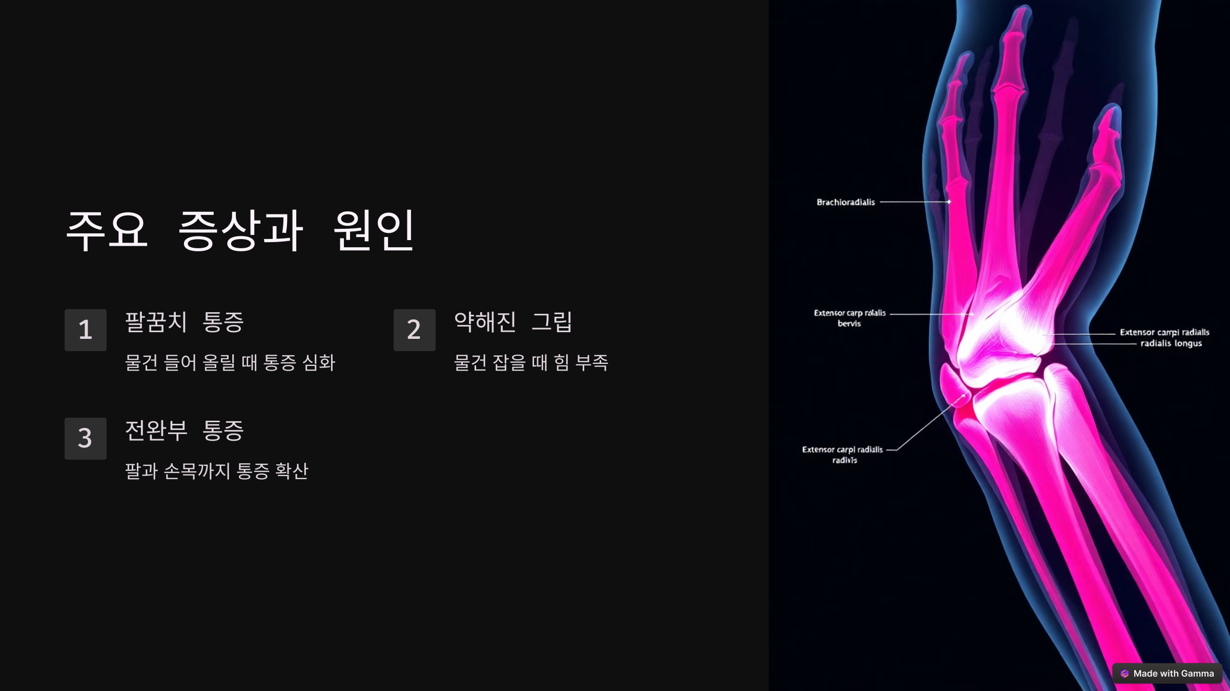 - 팔꿈치 바깥쪽 통증: 물건을 잡거나 들어 올릴 때 통증이 심해지며, 특히 무거운 물건을 들거나 팔을 비트는 동작에서 더 심화됩니다.