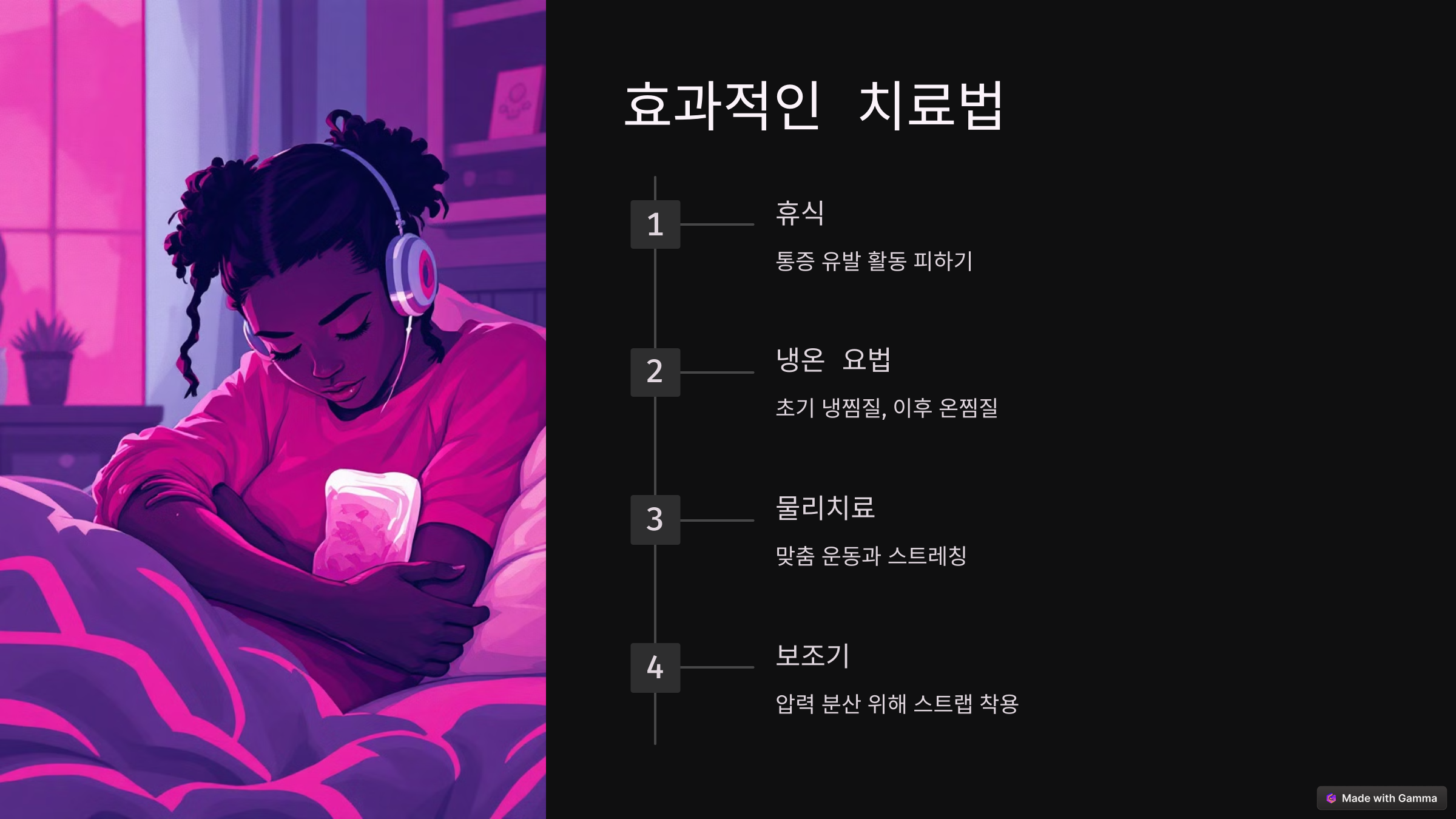 - 냉온 요법: 초기에는 냉찜질로 염증을 줄이고, 이후 온찜질로 혈액 순환을 촉진하여 회복을 돕습니다.