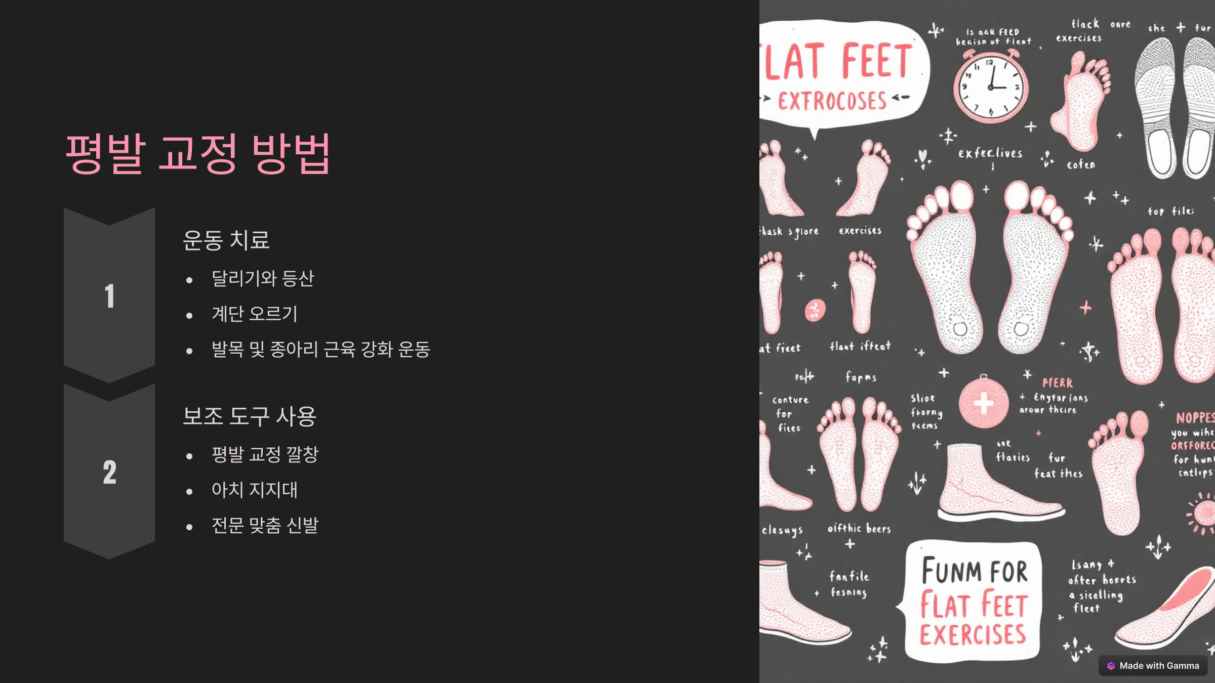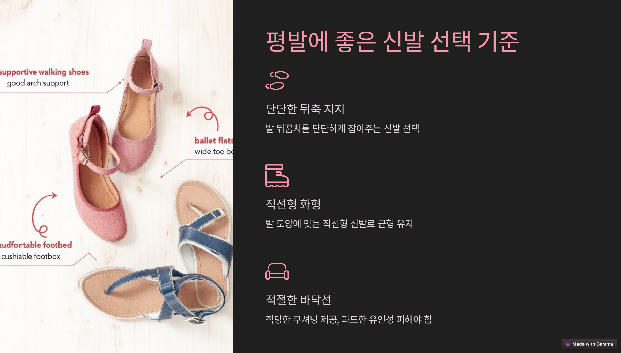 - 전문 맞춤 신발 👟: 발 모양에 맞춘 신발을 착용하면 발의 부담을 줄이고, 올바른 자세를 유지하는 데 도움이 됩니다.