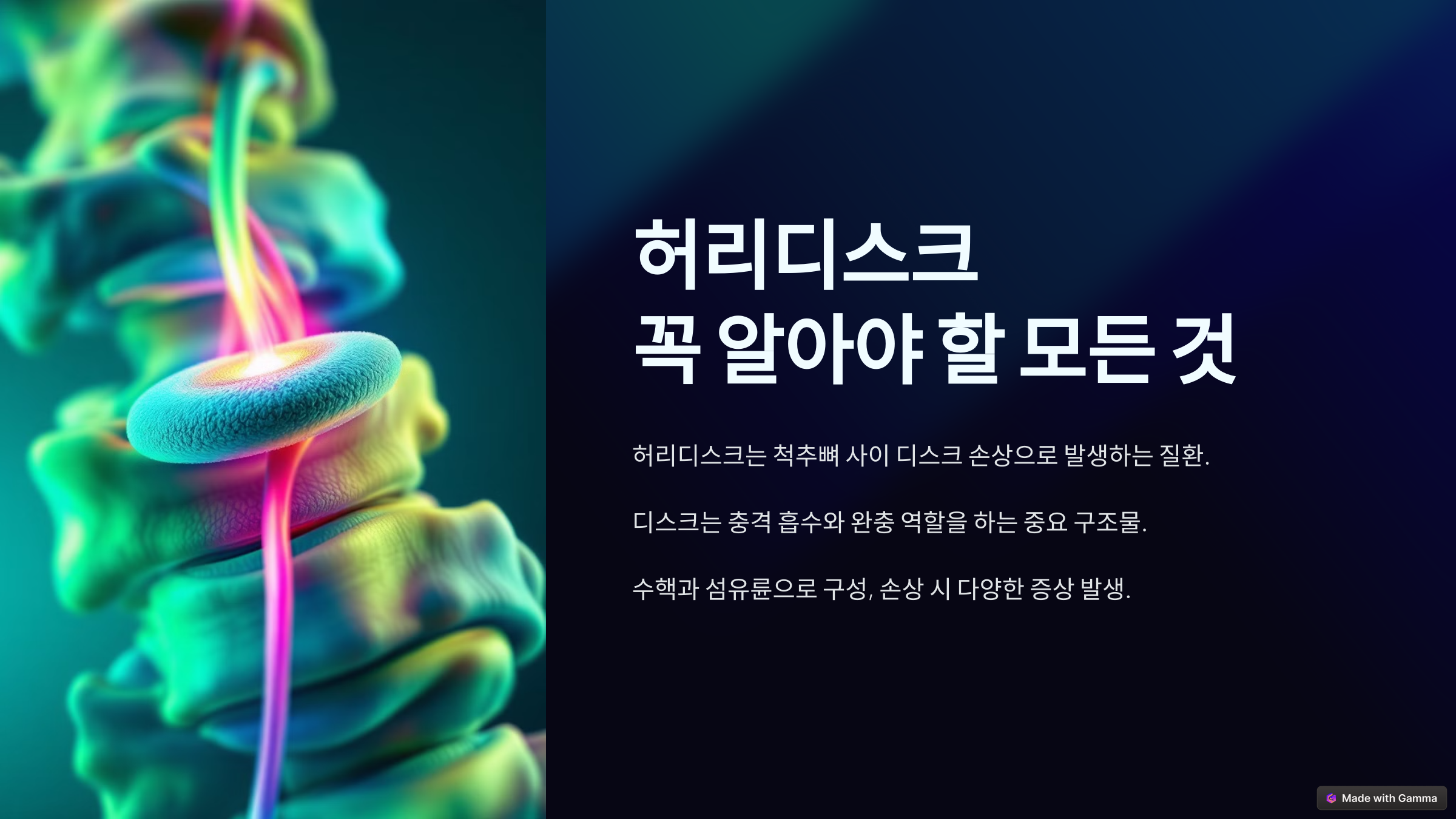 허리디스크는 척추뼈 사이에 있는 디스크(추간판)가 외부의 압력이나 잘못된 자세로 인해 손상되면서 발생하는 질환입니다. 🌀 디스크가 손상되면 내부의 젤리 같은 수핵이 밖으로 밀려 나와 신경을 압박하게 되어 다양한 증상이 나타날 수 있습니다. 💢 디스크는 척추뼈 사이에서 충격을 흡수하고 완충 역할을 하는 중요한 구조물입니다. 💧 디스크는 80% 정도가 수분으로 이루어진 젤리 같은 수핵과 이를 보호하는 섬유륜으로 구성되어 있습니다. 💥 수핵은 척추에 가해지는 압력을 흡수하는 역할을 하며, 섬유륜은 수핵을 감싸 충격으로부터 보호하는 기능을 합니다. 🩹 디스크가 손상되면 허리 통증과 다양한 증상이 나타날 수 있습니다.