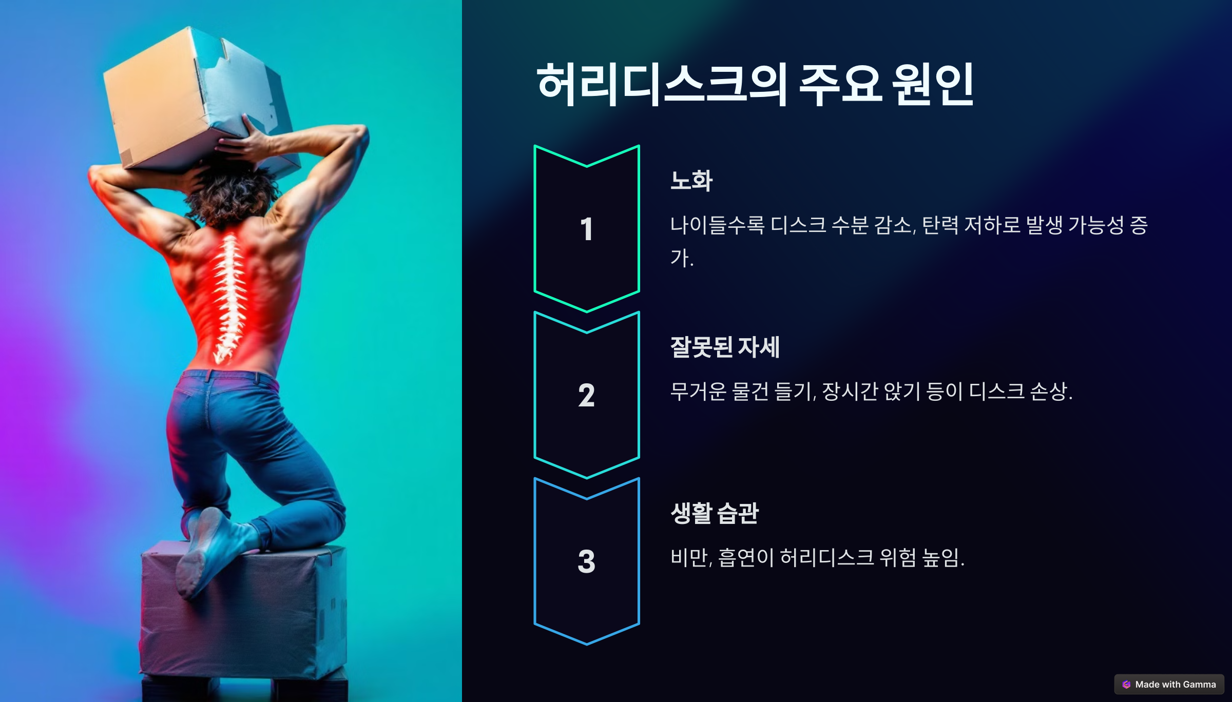 - 잘못된 자세와 신체 사용: 🙇♂️ 무거운 물건을 잘못 들어 올리거나 장시간 앉아 있는 것, 올바르지 않은 자세 등이 디스크 손상의 주요 원인입니다. 반복되는 나쁜 자세는 디스크에 지속적인 무리를 줍니다.