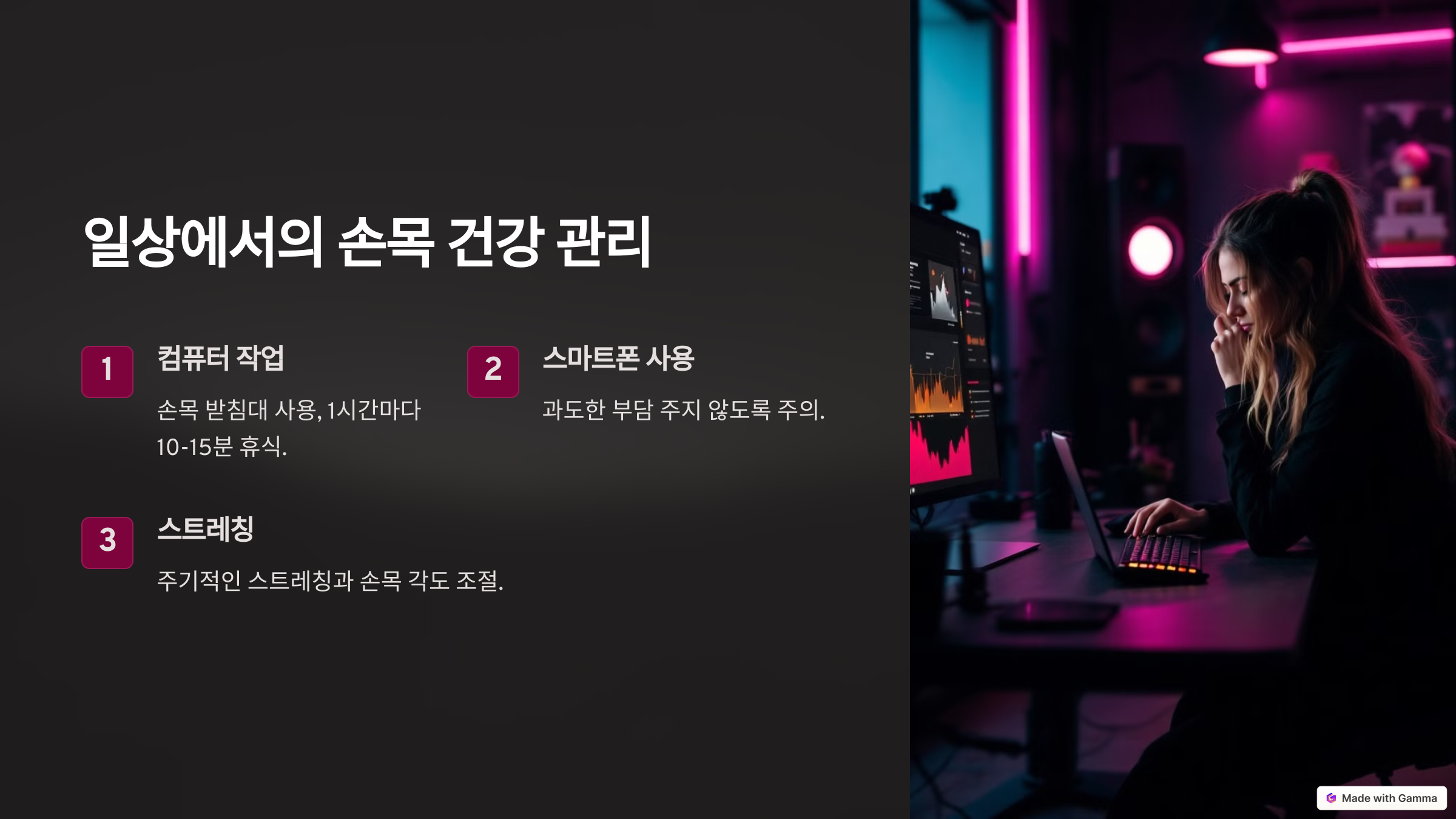 💻 작업 시 손목 받침대를 사용하고, ⏱️ 1시간마다 10-15분 휴식을 취하는 것이 중요합니다. 이는 손목에 가해지는 부담을 줄이기 위해 필요합니다. 📱 사용 시에도 손목에 과도한 부담을 주지 않도록 주의하며, 주기적인 스트레칭과 손목 각도 조절은 통증 예방에 큰 도움이 됩니다.