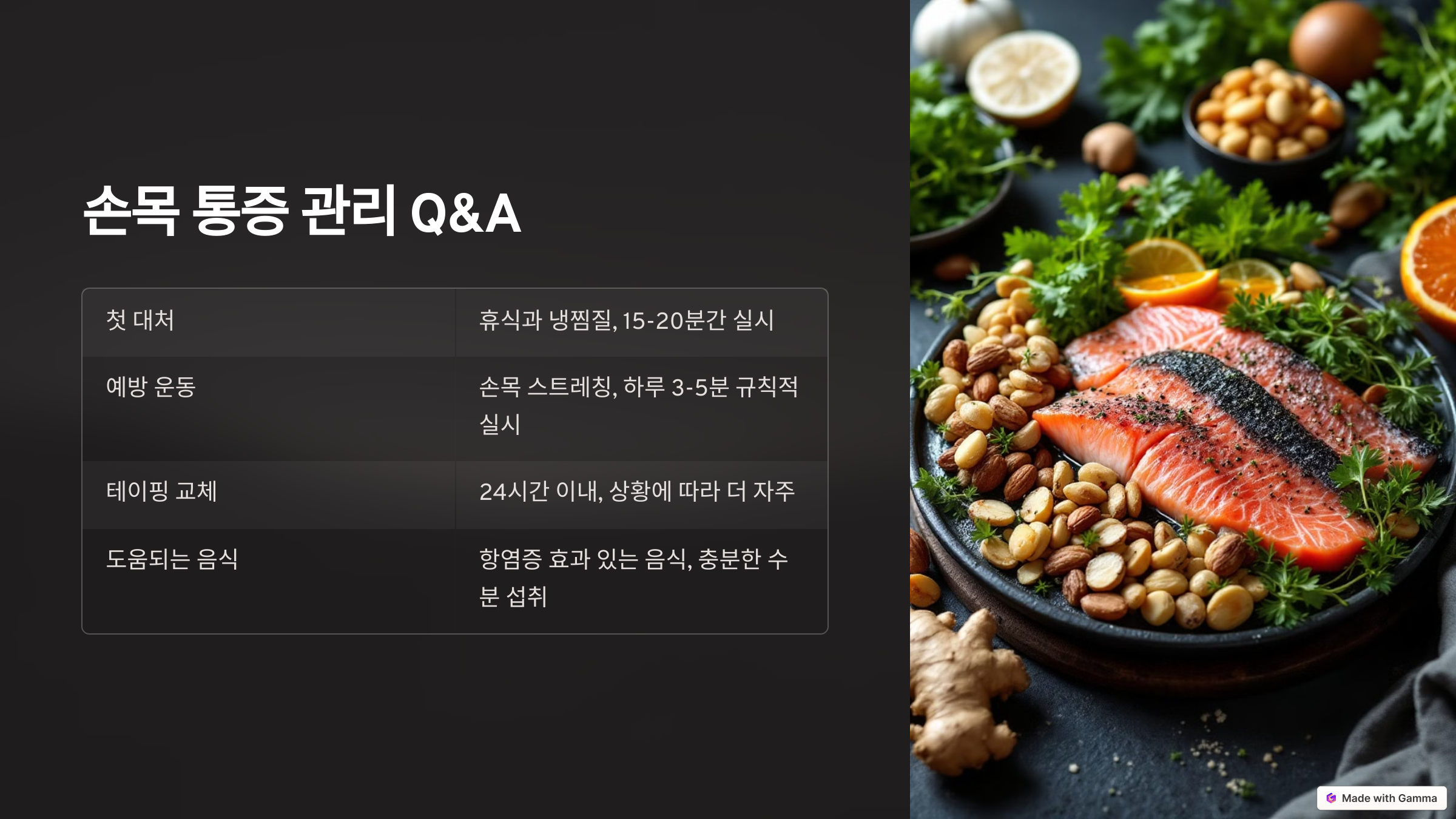 A1. 🛌 휴식과 ❄️ 냉찜질이 중요합니다. 통증이 있는 손목을 쉬게 하고, 얼음찜질을 ⏱️ 15-20분간 실시하면 염증과 통증을 줄일 수 있습니다. 통증이 지속된다면 🏥 전문의와 상담하세요.